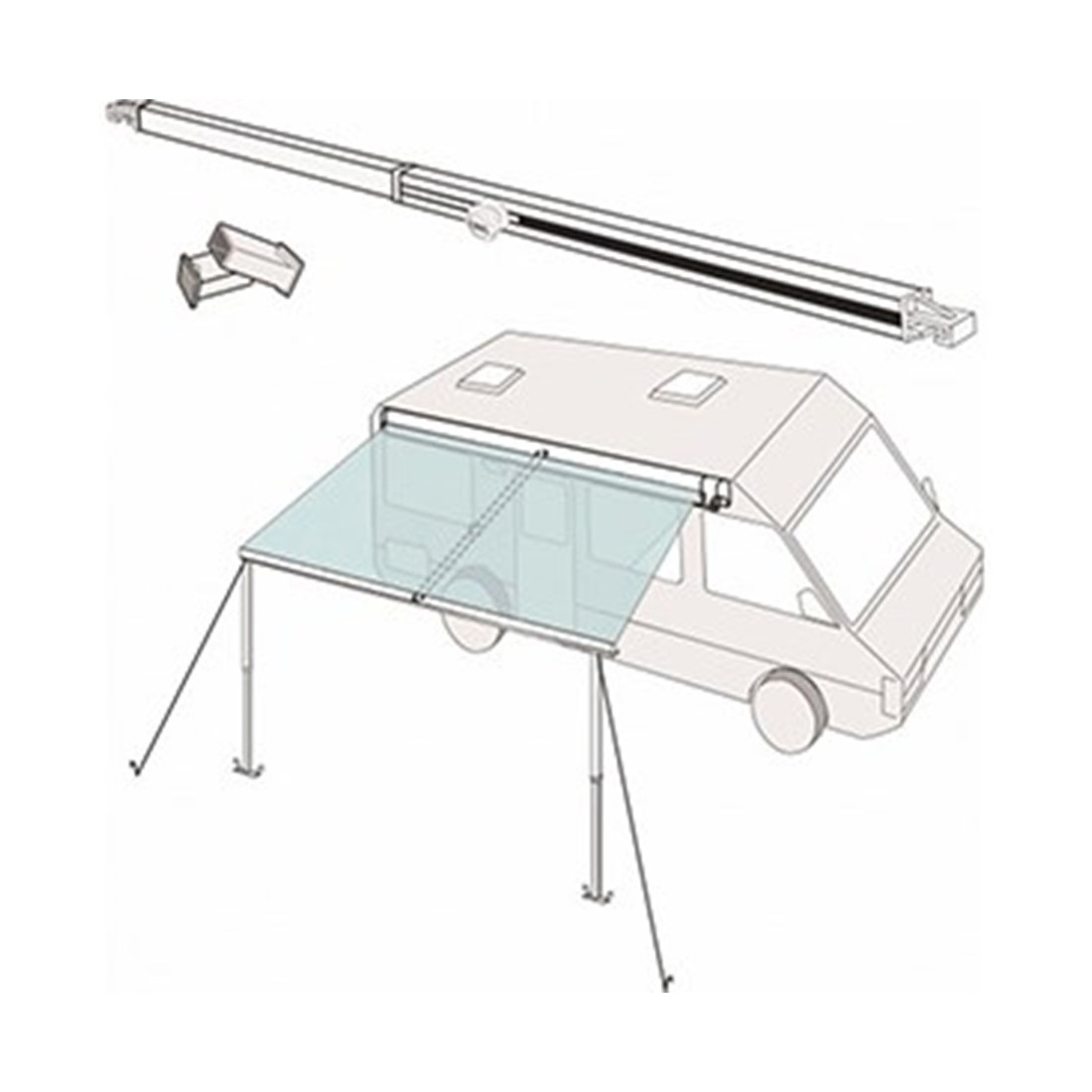 La barra es ajustable en longitud, desde 142 cm hasta 265 cm, lo que la hace adecuada para toldos con una extensión de hasta 275 cm. Incluye ganchos específicos para un cómodo almacenamiento en el interior del vehículo.