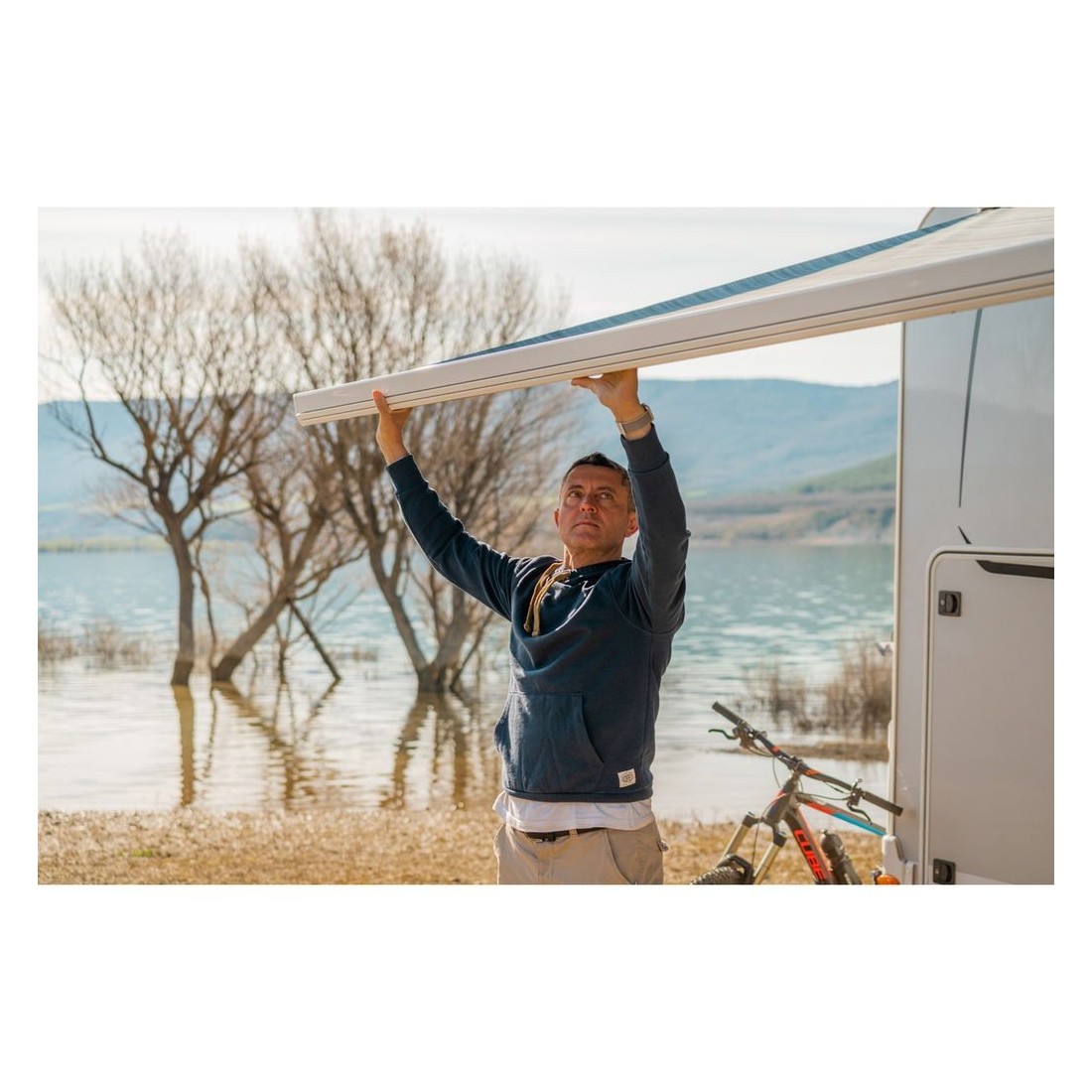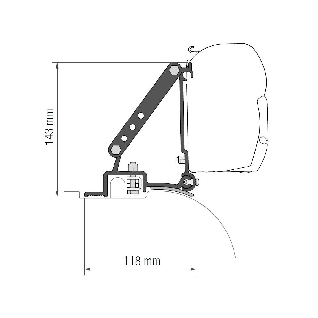 Con 3 m de largo, el toldo se instala fácilmente en la zona alta del techo de la furgoneta utilizando los soportes específicos incluidos, proporcionando una estabilidad y firmeza sin igual.
