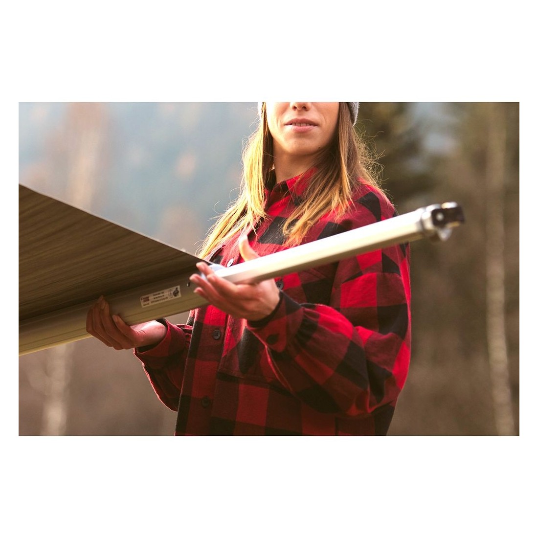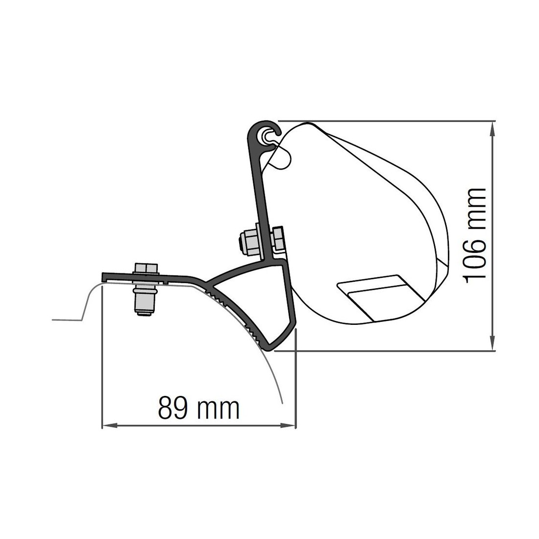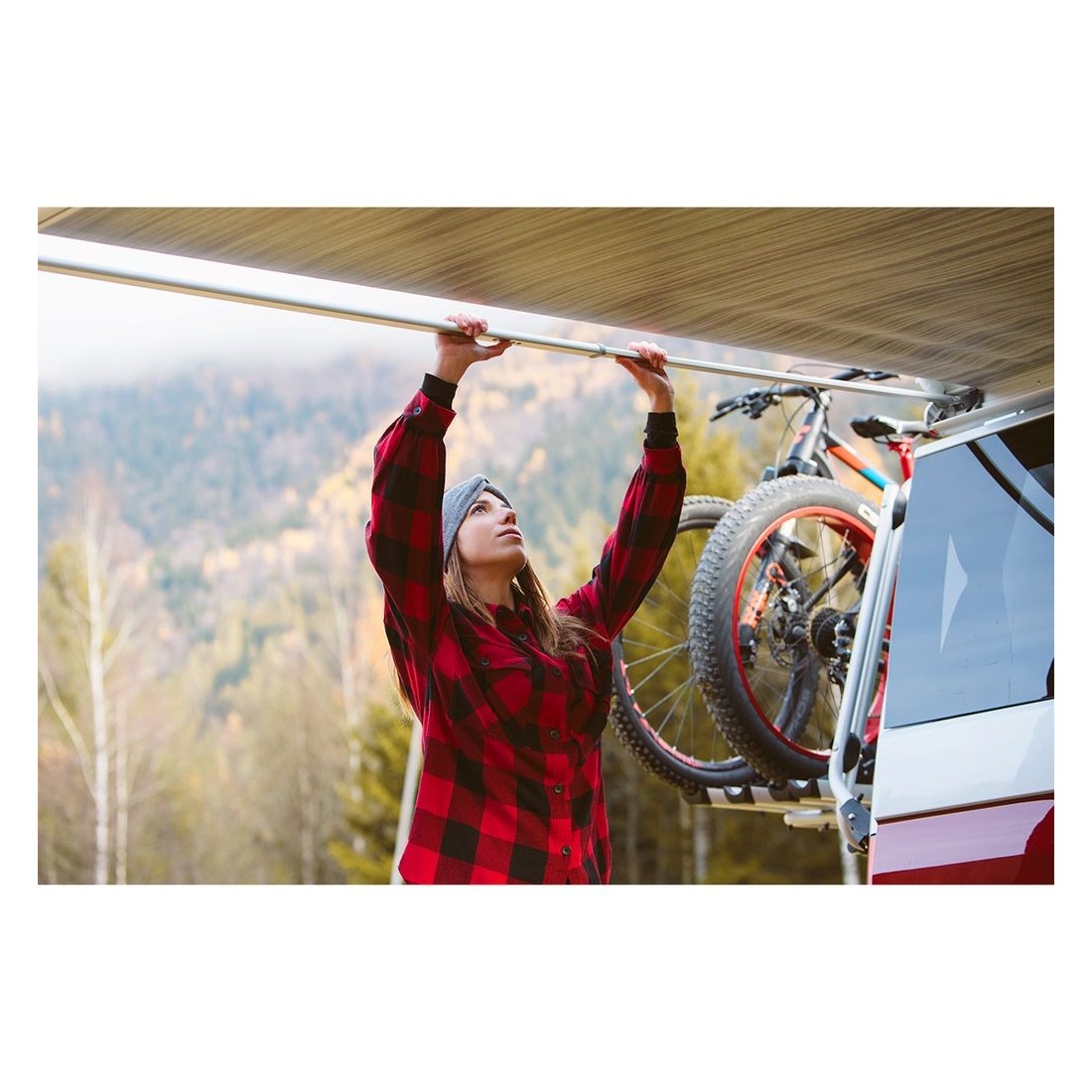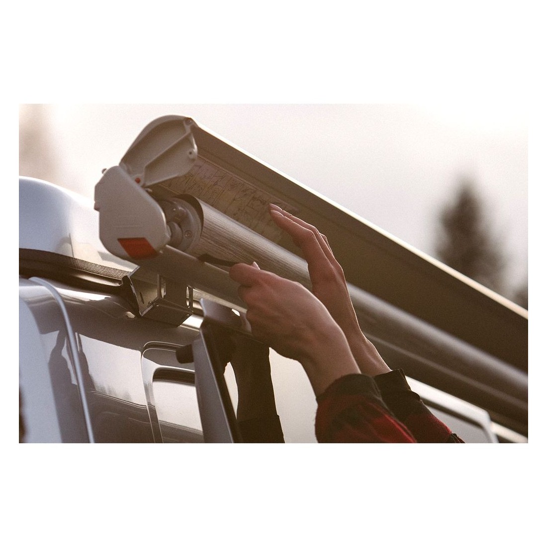Con 2.20 m de largo, el toldo se instala fácilmente en la zona alta del techo de la furgoneta utilizando los soportes específicos incluidos, proporcionando una estabilidad y firmeza sin igual.