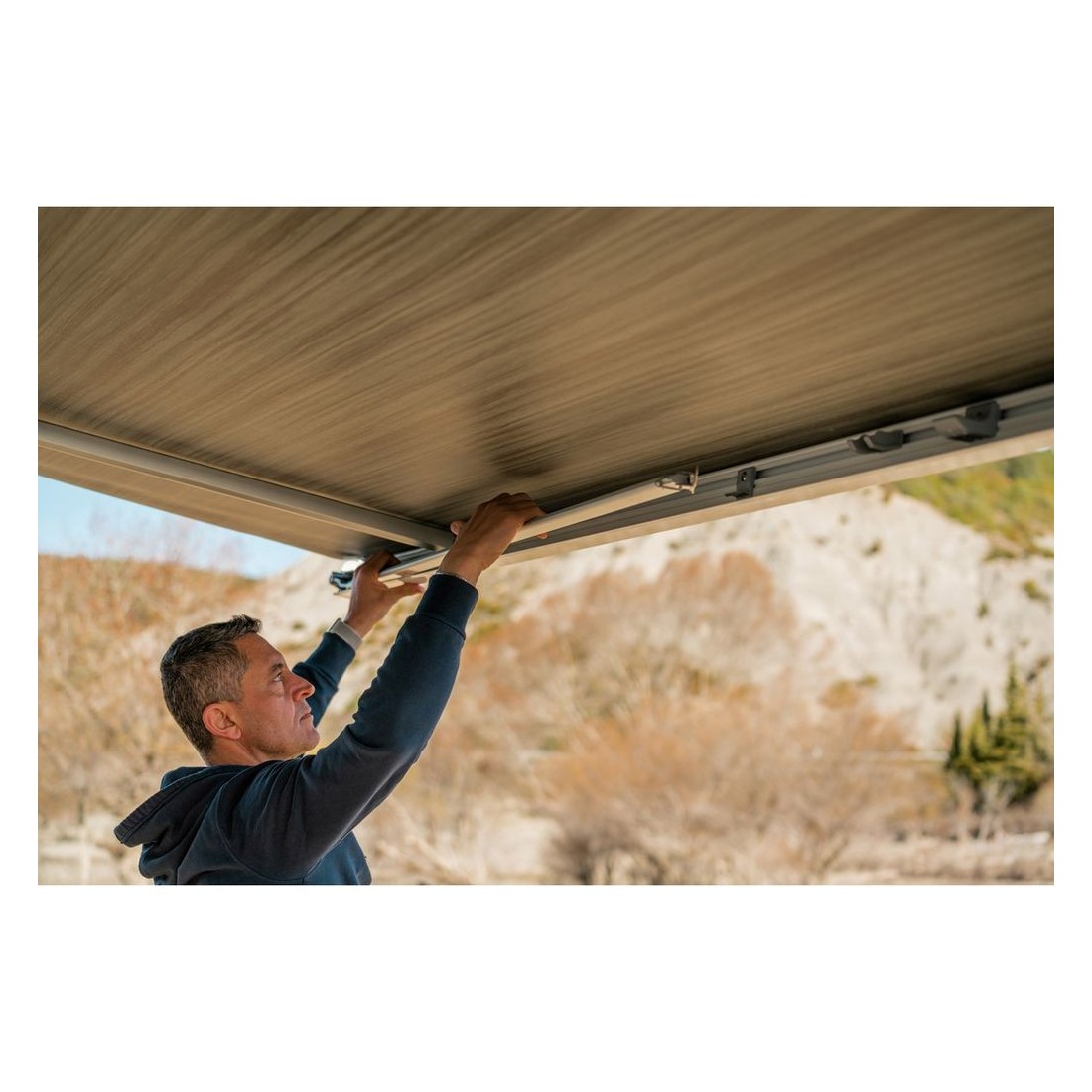 Con 4 m de largo, el toldo se instala fácilmente en la zona alta del techo de la furgoneta utilizando los soportes específicos incluidos, proporcionando una estabilidad y firmeza sin igual.