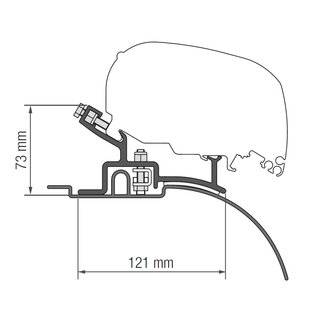 Con 2.90 m de largo, el toldo se instala fácilmente en la zona alta del techo de la furgoneta utilizando los soportes específicos incluidos, proporcionando una estabilidad y firmeza sin igual.