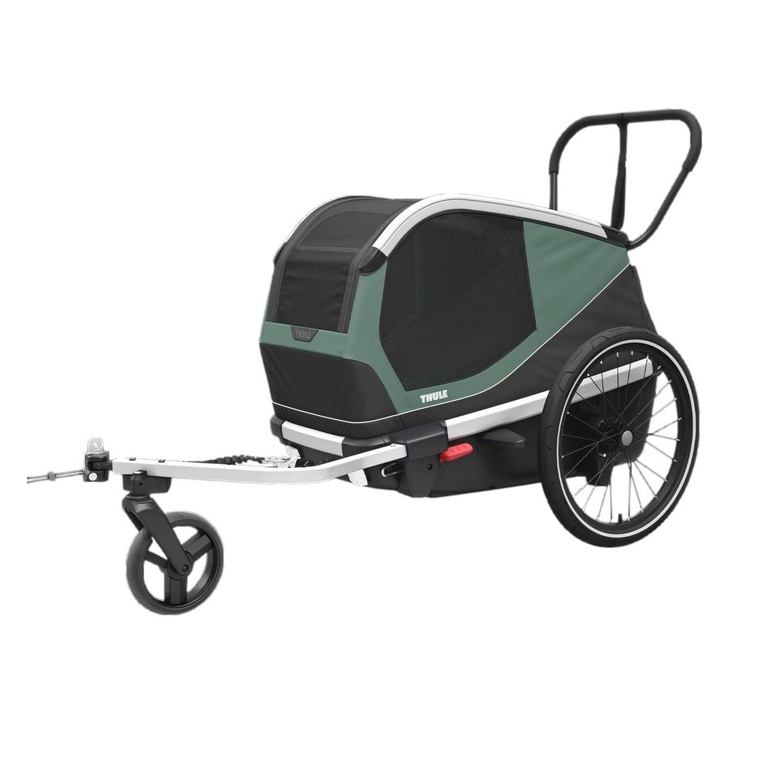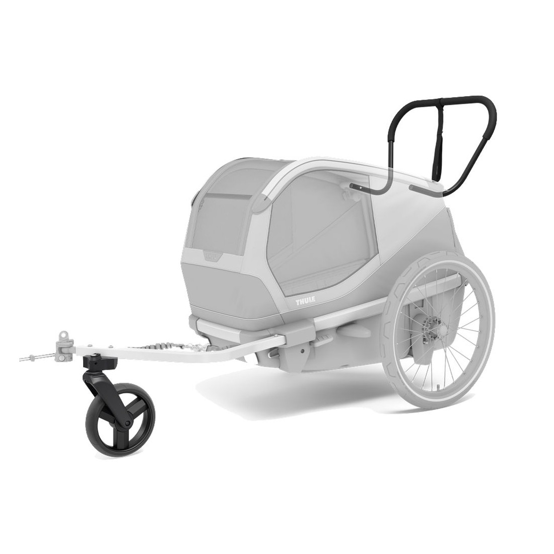 Añadiendo una rueda y un manillar, podrás convertir el remolque en una silla de paseo específica para mascotas. Además, la rueda de la silla de paseo se puede acoplar al brazo de enganche cuando vayas en bicicleta, facilitando el cambio entre modos de manera eficiente.