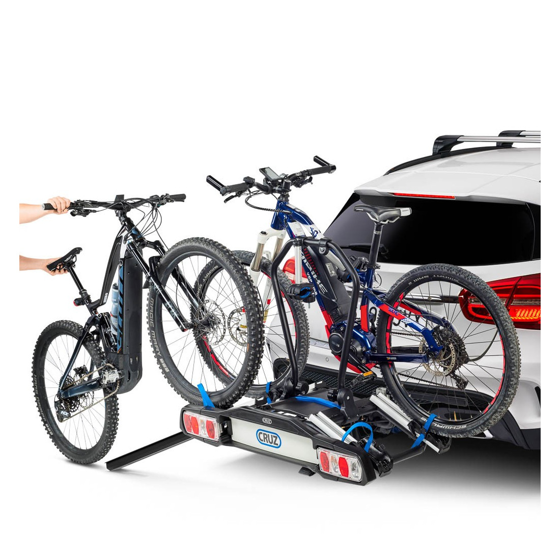 Portabicicletas CRUZ PIVOT EBIKE para instalar sobre la bola de remolque del vehículo. Diseñado para quienes buscan comodidad, seguridad y capacidad al transportar bicicletas eléctricas.