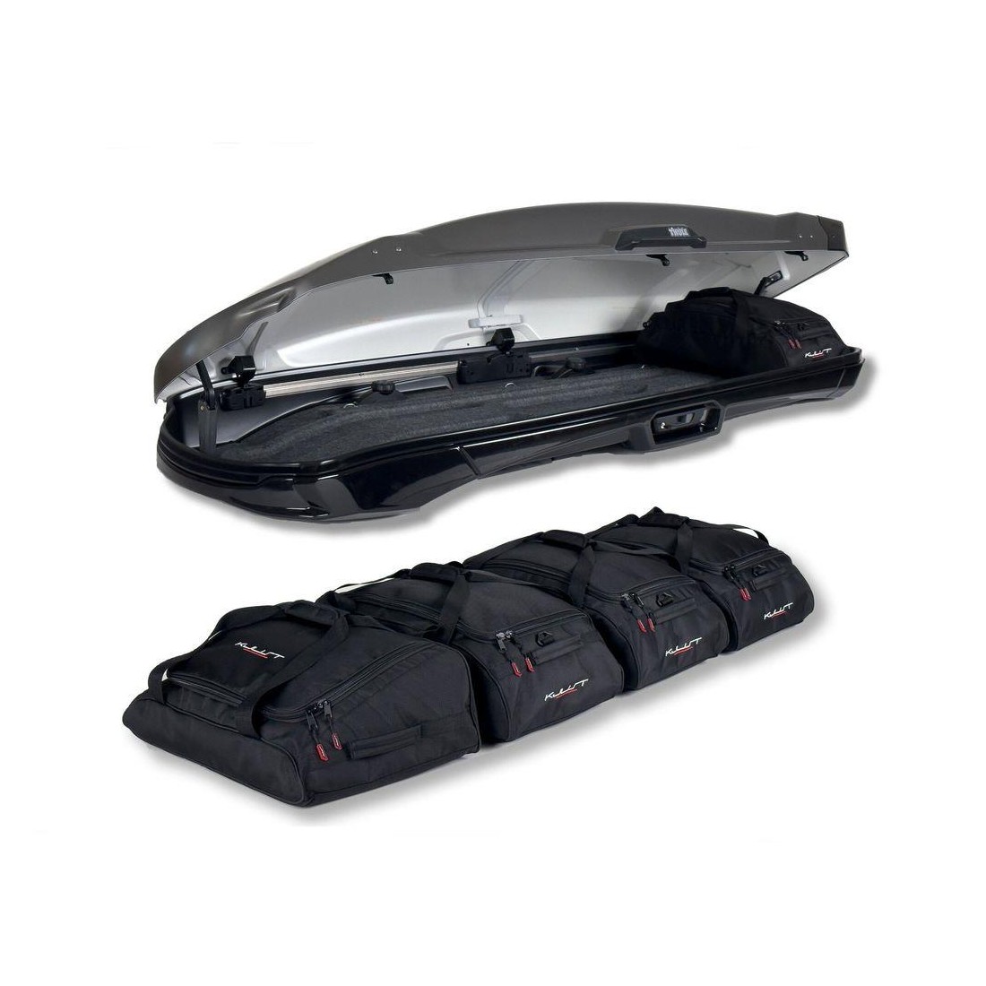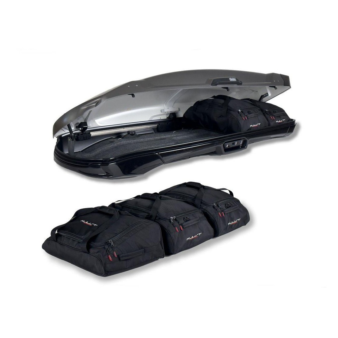 Este conjunto de cinco bolsas/maletas ha sido diseñado a medida para adaptarse perfectamente al cofre de techo THULE Vector Alpine. Su objetivo es ofrecer la mejor optimización del espacio disponible, permitiendo una organización práctica y estructurada del equipaje.
