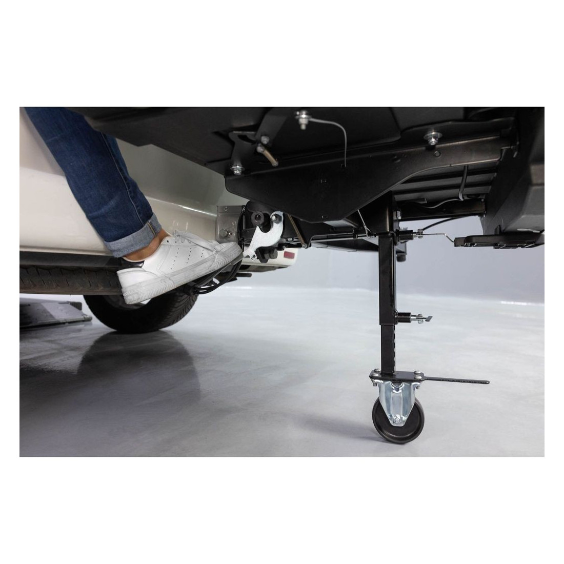 Novedoso sistema que apoya el cofre sobre una rueda de hockey, permitiendo un giro de 180 grados y así poder abrir el portón sin ningún obstáculo. Además, el sistema de seguridad evita que la rueda pueda caer durante la conducción o se pliegue accidentalmente cuando se está usando.