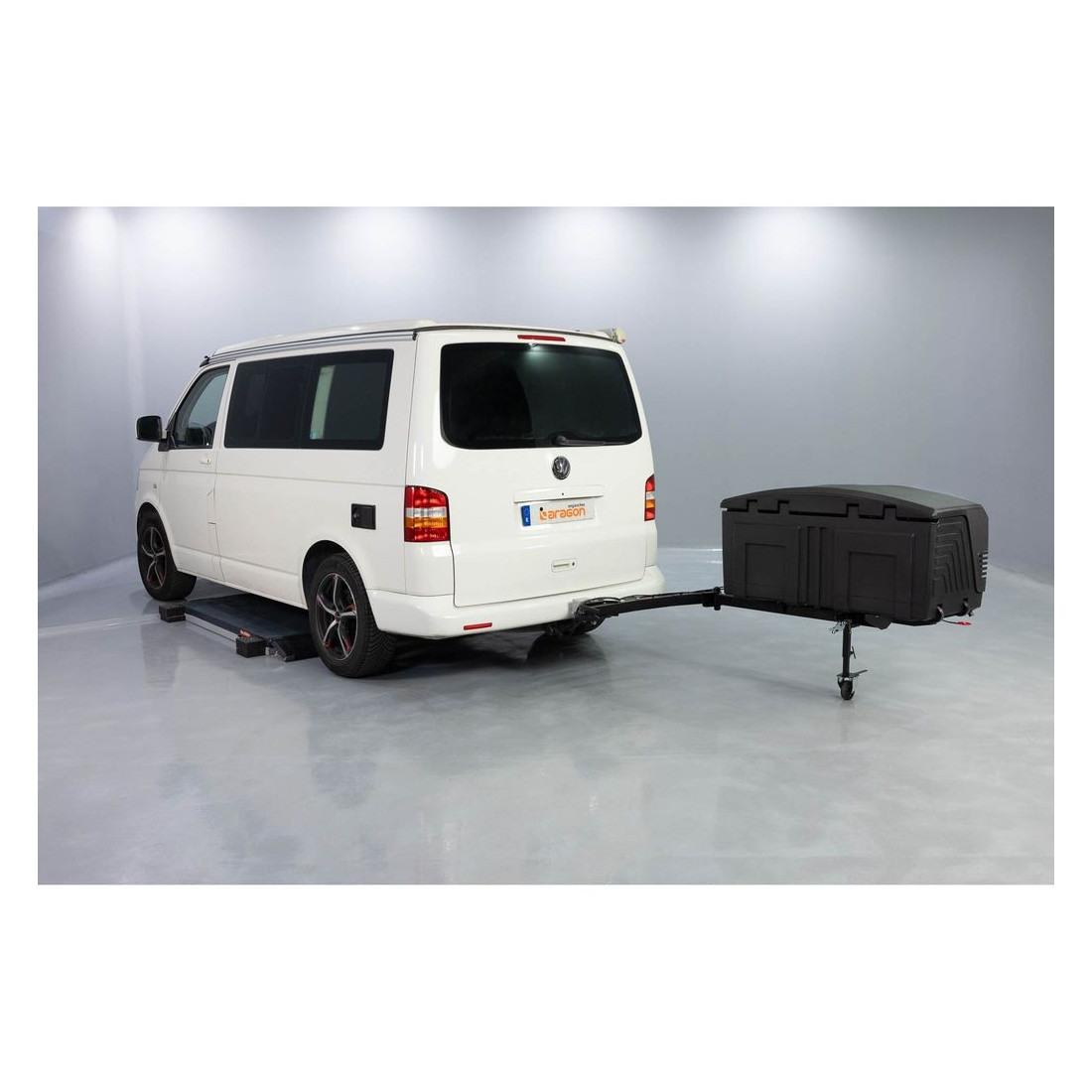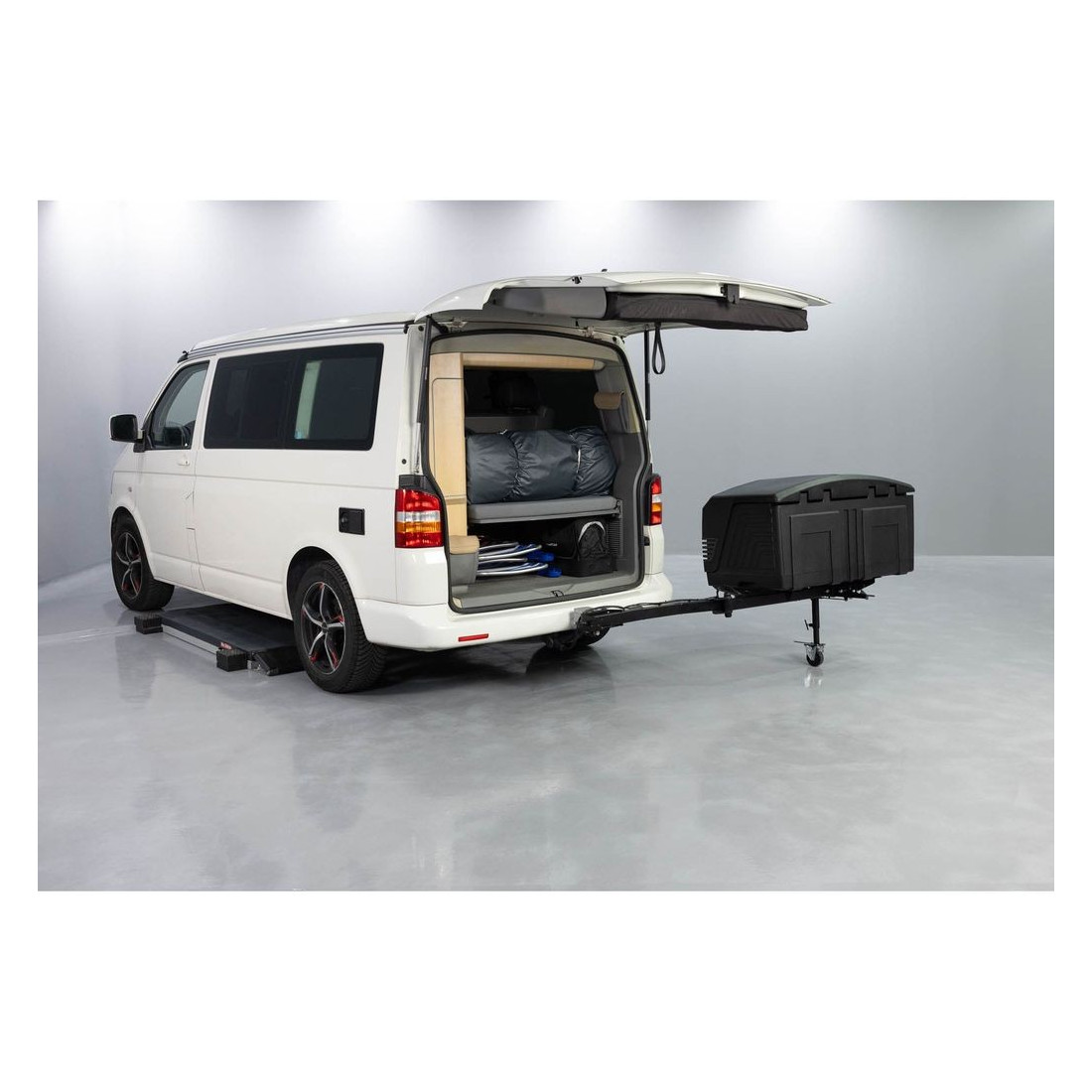Portaequipajes trasero destinado especialmente para furgonetas y vehículos camperizados ya que permite la apertura de puertas y portones con el cofre instalado. Capacidad de carga de 330 litros.