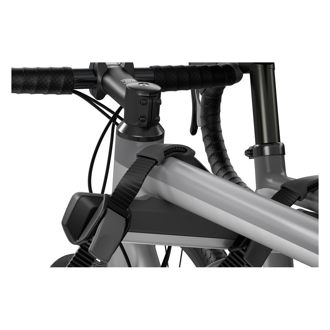 Bloquea la bicicleta en el portabicicletas y éste en las barras de techo (cerraduras incluidas).