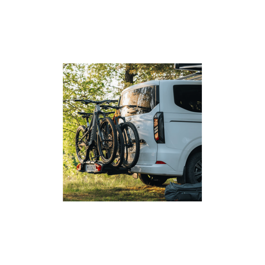 El portabicis Thule VeloSpace 3 soporta bicicletas de hasta 30 kg y distancias entre ejes de hasta 1350 mm, incluyendo modelos eléctricos y de montaña. Su plataforma robusta mantiene una separación de 25 cm entre cada bicicleta, reduciendo al mínimo el riesgo de contacto o daños durante el transporte.