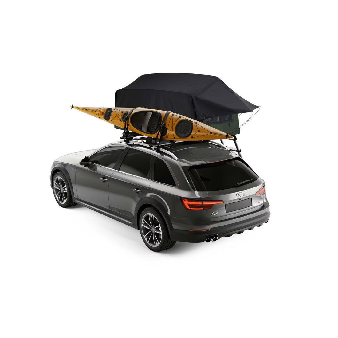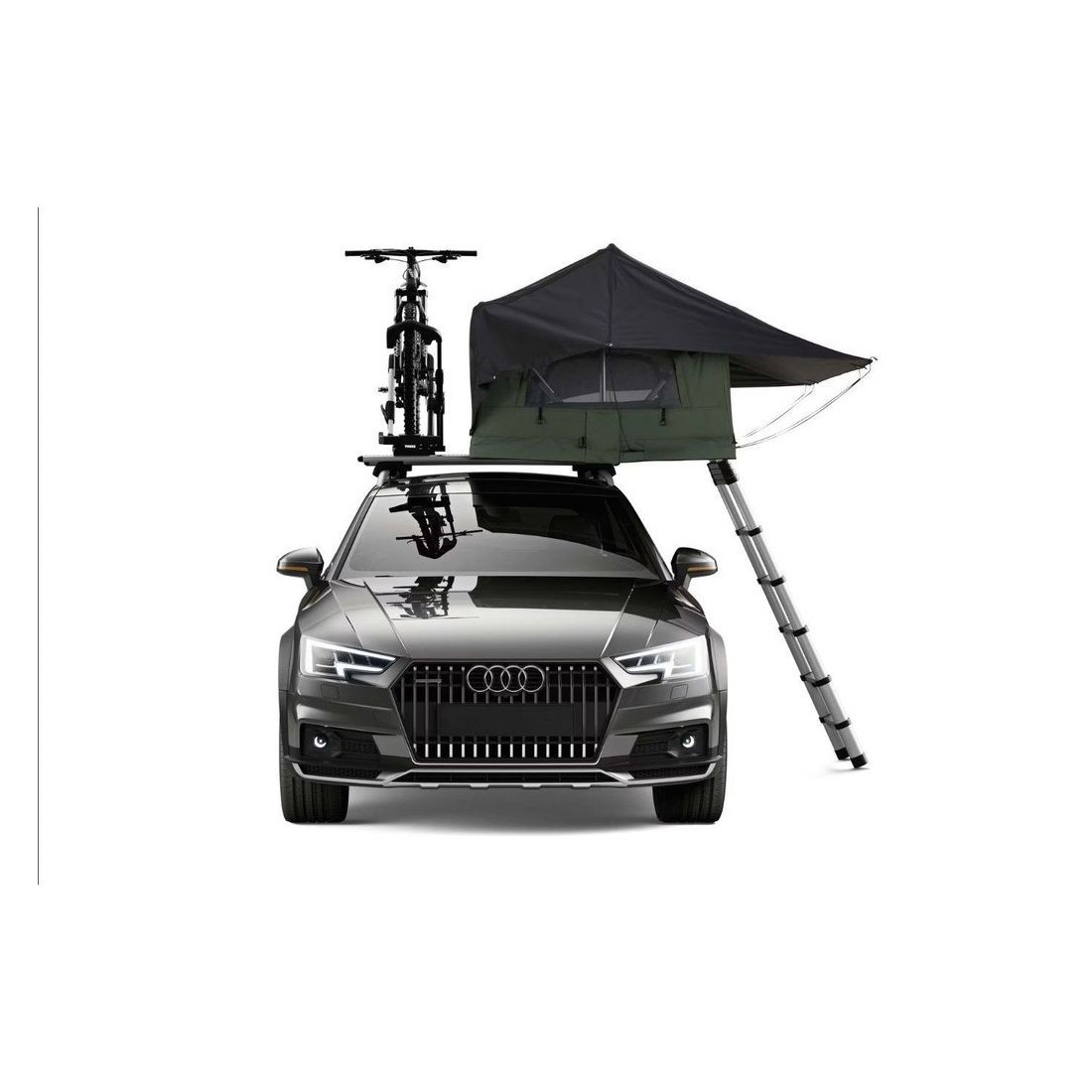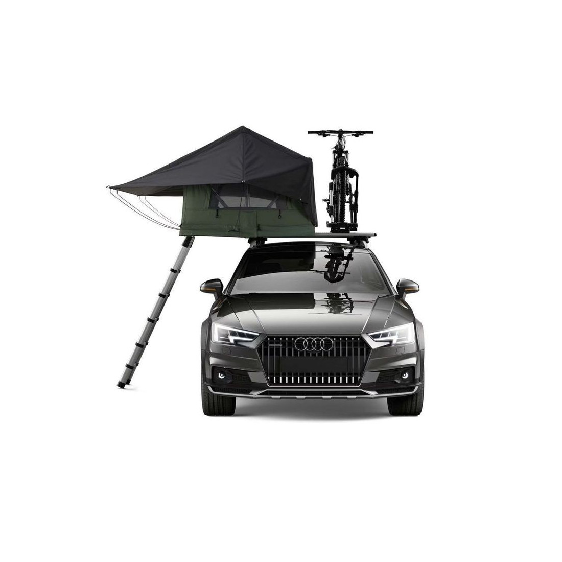 Tienda de techo para coche con capacidad de 2 personas con instalación sobre barras portaequipajes. Posibilidad de llevar también un portabicicletas.