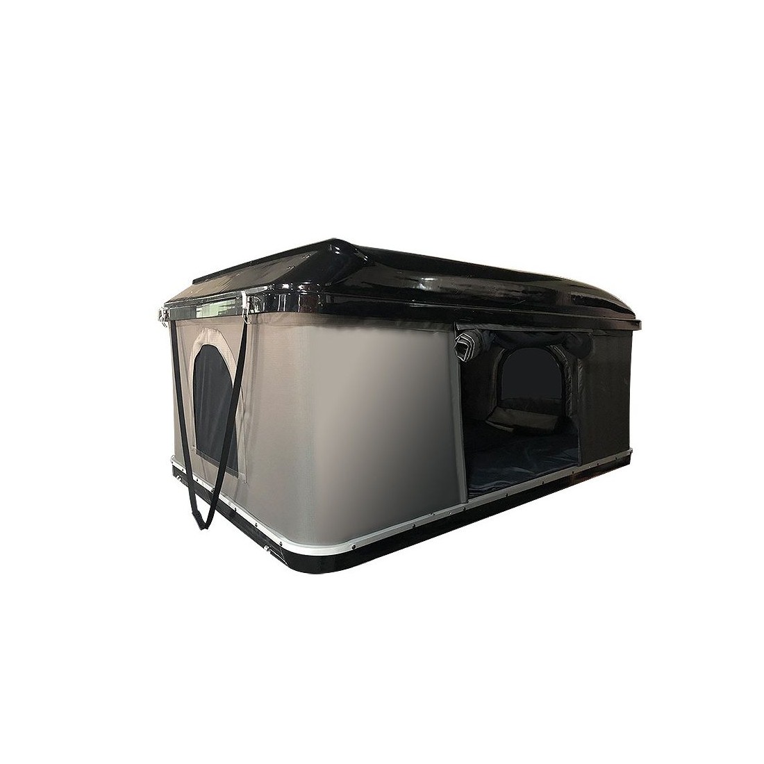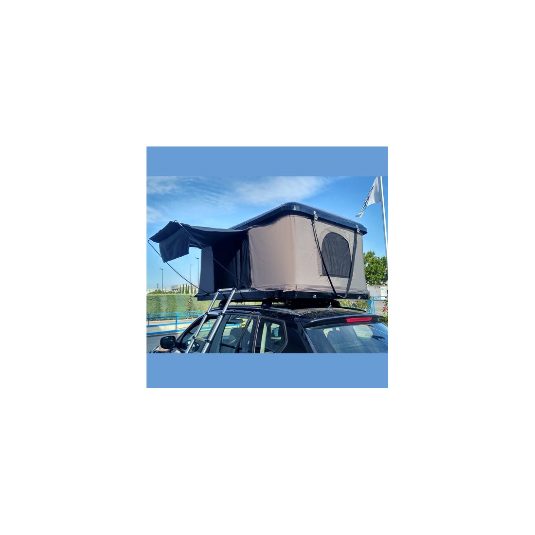 Tienda de techo para coche con armazón duro, apertura vertical y capacidad para 2 personas. Se instala sobre barras portaequipajes.