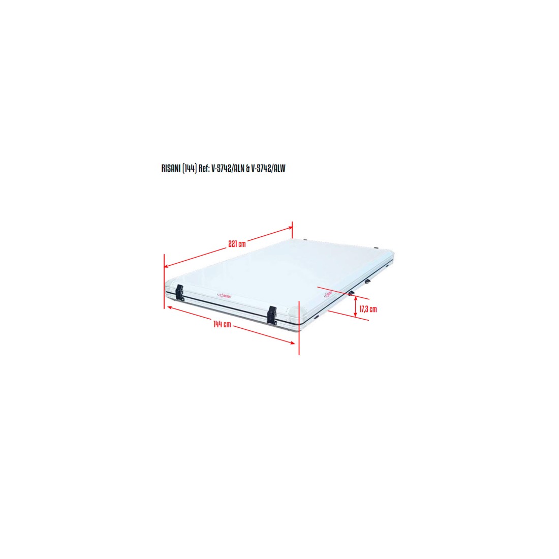 Su apertura de forma vertical hace que se abra y cierre de forma muy sencilla. Las carcasas (superior e inferior) están fabricadas en aluminio honeycomb (panel nido de abeja), haciendo que sea muy resistente a los impactos y reduciendo su peso. Lona en tejido Oxford PU4000 UPF50+ con propiedades waterproof 280D.