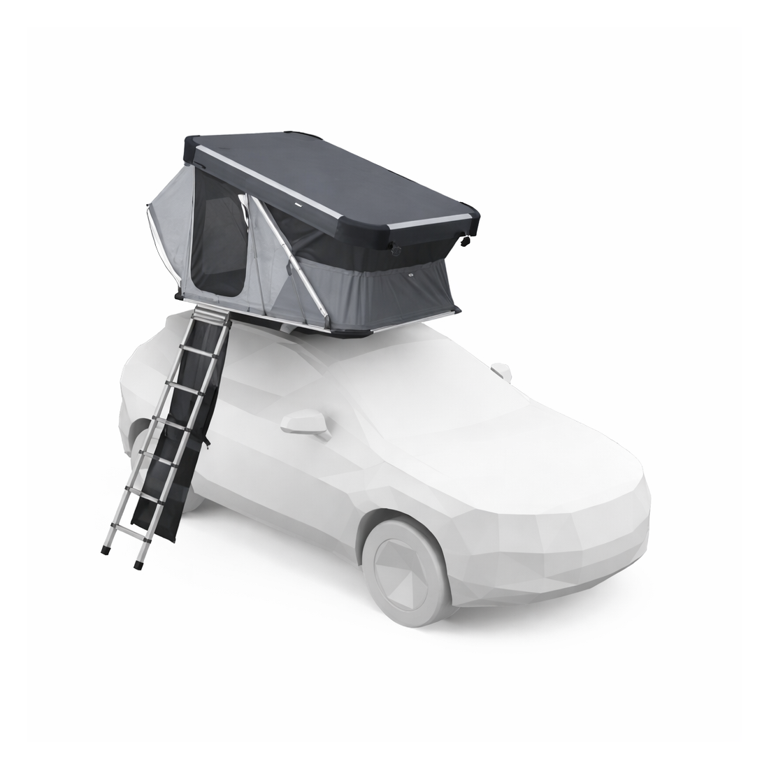 Tienda de techo rígida que ofrece un espacio cómodo y funcional en turismos, SUVs, furgonetas, pick-up o todoterrenos. Capacidad para 2 adultos. Instalación sobre barras de techo. Apertura rápida. Colchón convertible en sofá.