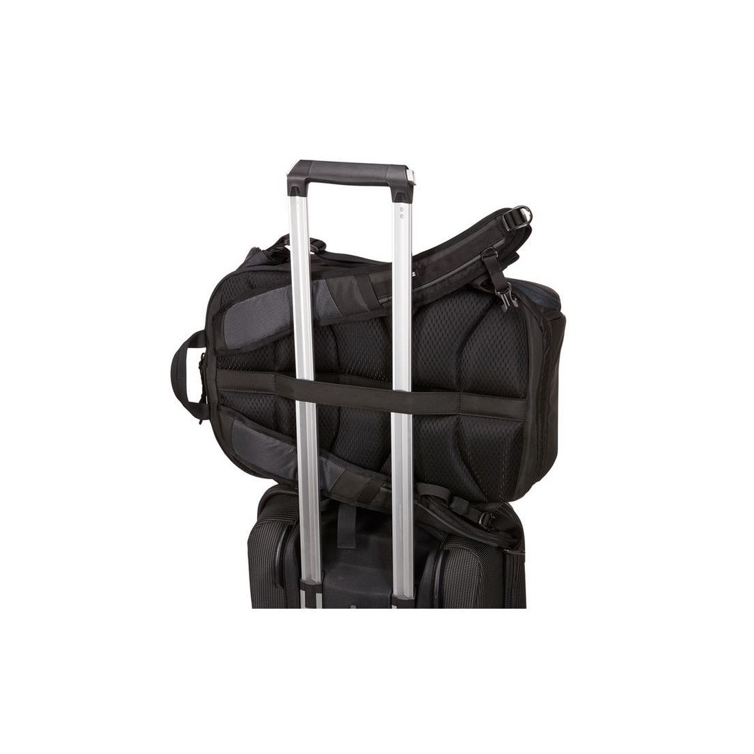 Transporte seguro de la mochila sobre un equipaje con ruedas mediante el panel de paso de equipaje integrado.