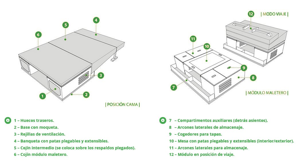 Con este kit camper, puedes equipar tu furgoneta con una cama, una mesa y una amplia capacidad de almacenaje, ofreciendo una solución completa para tus necesidades de viaje y estancia, sin preocupaciones ni limitaciones de alojamiento.