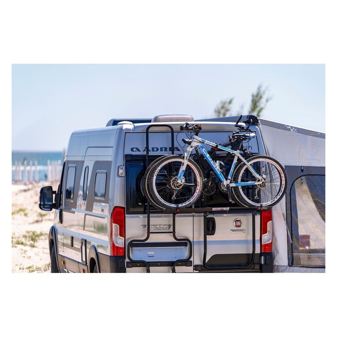 Se instalan los railes específicos para este modelo en la puerta trasera derecha, que serán los encargados de fijar y sujetar el portabicicletas Fiamma DJ. Además, permite la apertura de la puerta con el portabicicletas instalado, incluso con las bicis cargadas. Posibilidad de montar una escalera Deluxe en la puerta trasera izquierda.