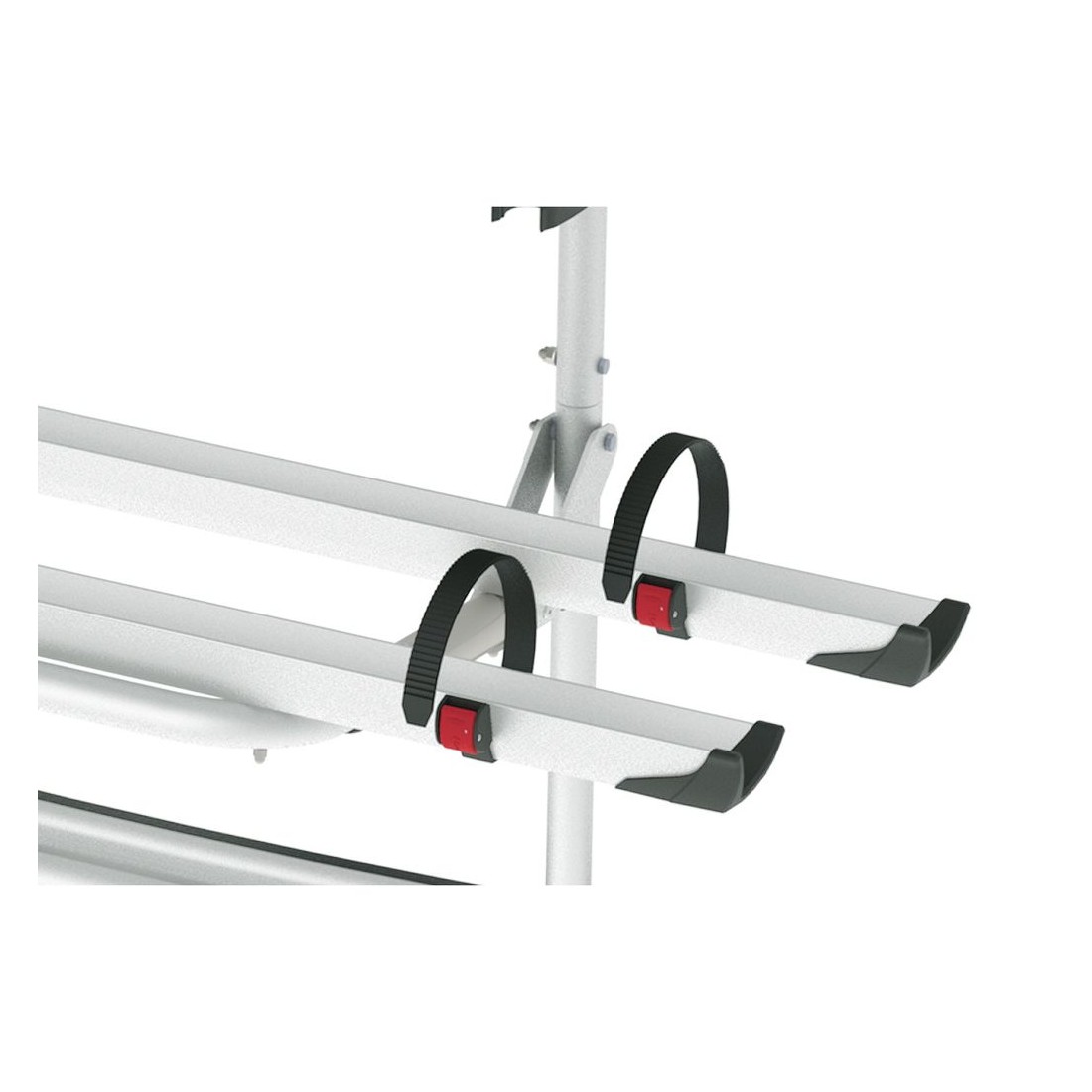 La instalación se realiza fijándolo al borde del portón trasero mediante tensores integrados en el portabicicletas. Garantiza estabilidad y facilidad de montaje.