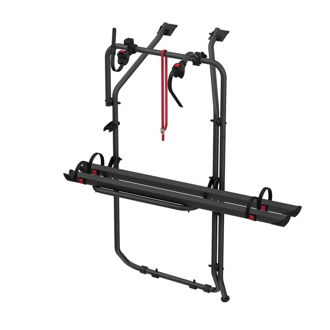 La instalación se realiza fijándolo al borde de la puerta trasera izquierda mediante tensores integrados en el portabicicletas. Garantiza estabilidad y facilidad de montaje.