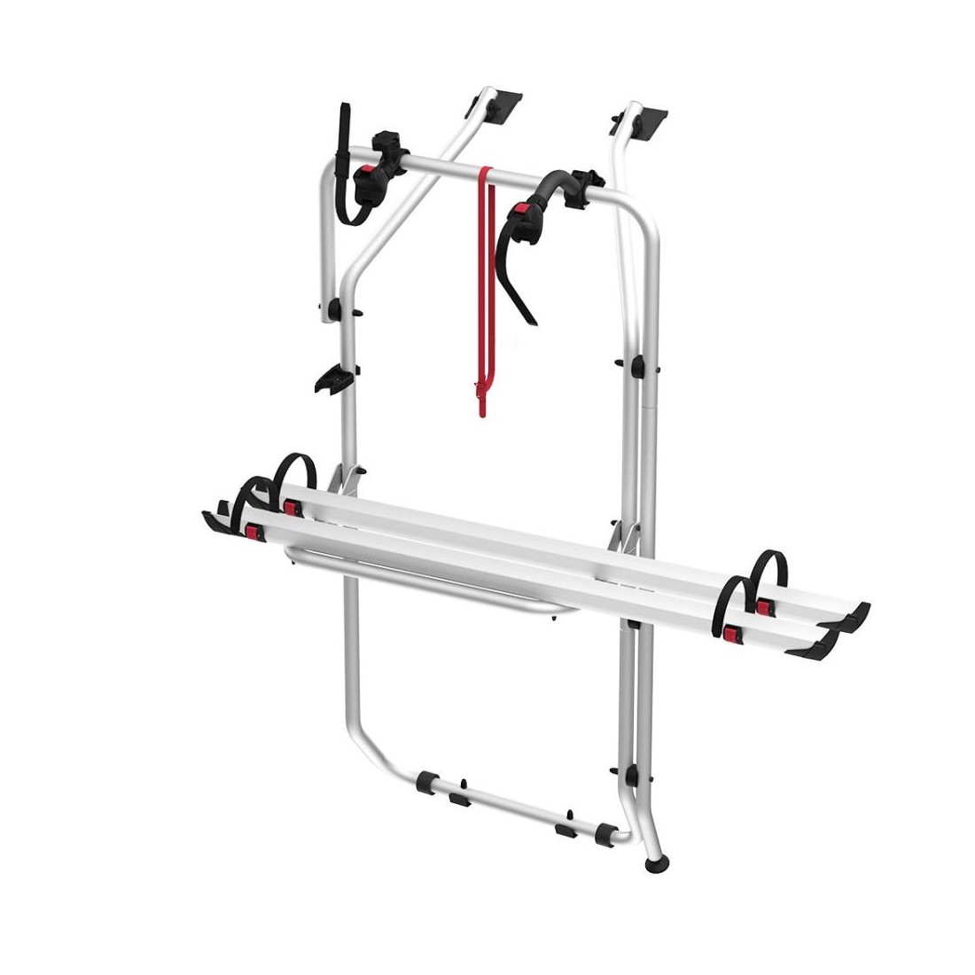 La instalación se realiza fijándolo al borde de la puerta trasera izquierda mediante tensores integrados en el portabicicletas. Garantiza estabilidad y facilidad de montaje.