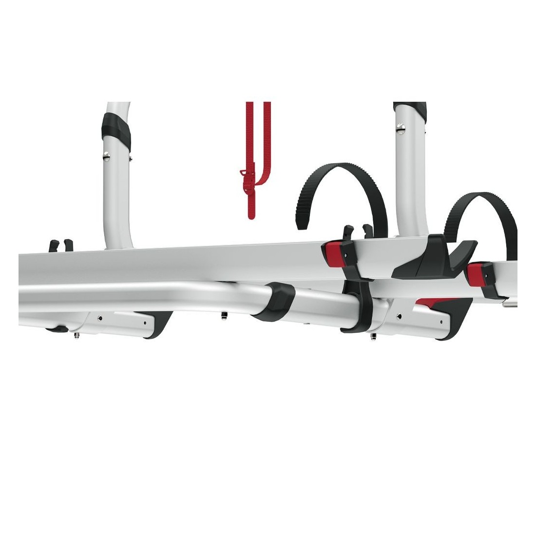 Portabicicletas específico para autocaravanas resistente y seguro. Permite el transporte de 2 bicicletas en la zona trasera y es compatible con bicicletas eléctricas.