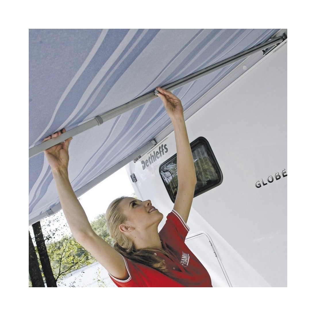 Feito de alumínio anodizado de alta resistência, incorpora um sistema de bloqueio Secure-Lock que garante um ajuste firme e seguro. A sua instalação é rápida e fácil, sem necessidade de furar o toldo.