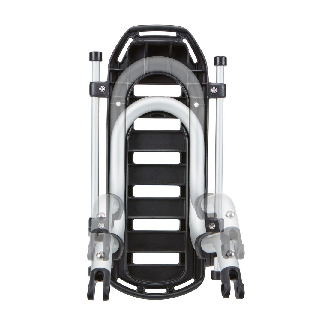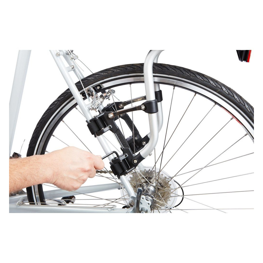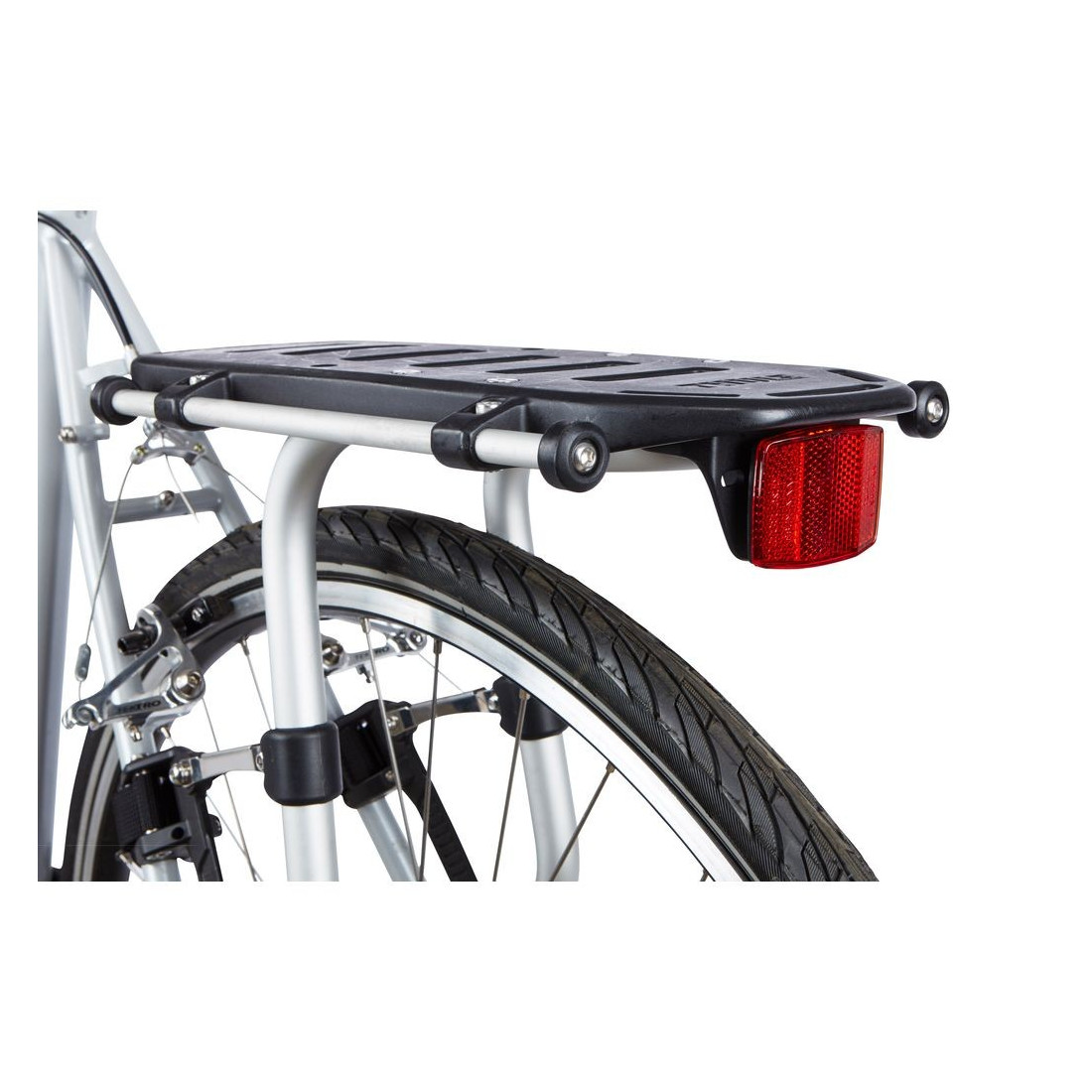 O porta-bagagens permanece seguro com cargas pesadas com pegas cobertas de borracha que evitam o deslizamento e protegem o quadro da bicicleta.