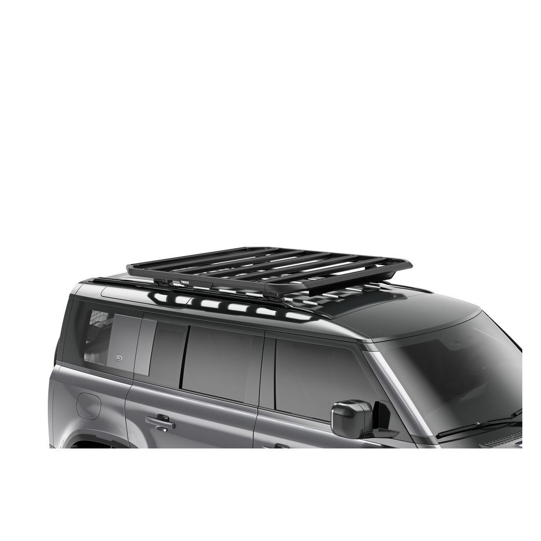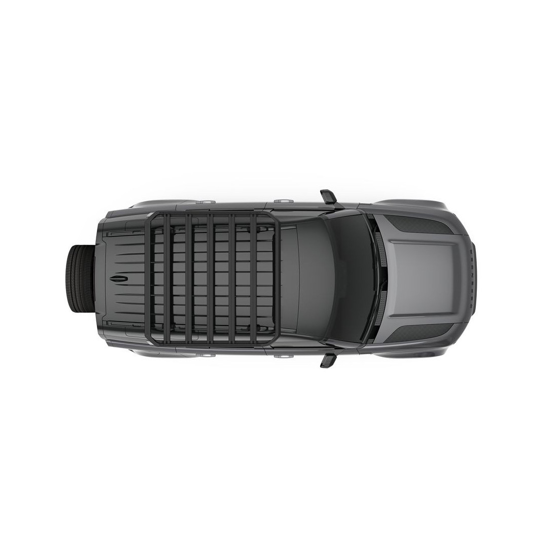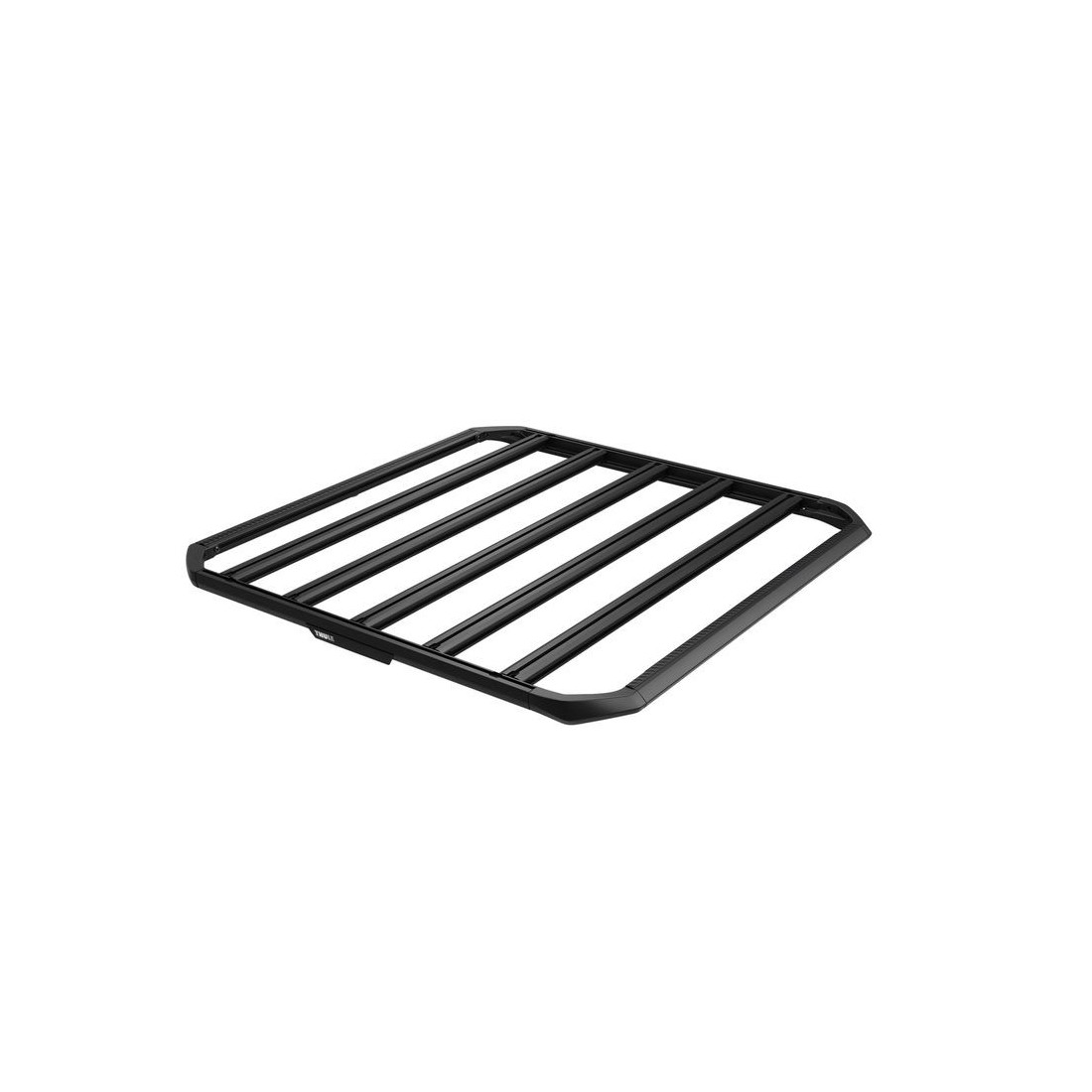 As ranhuras em T integradas em cada barra facilitam a fixação de acessórios como suportes adicionais, tendas de tejadilho, equipamento de campismo, componentes para overlanding e muito mais. Além disso, a plataforma pode transformar-se numa cesta de carga através da incorporação do Thule Caprock Railing Kit.