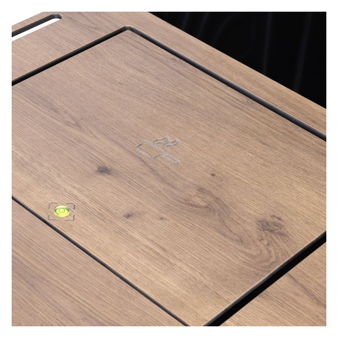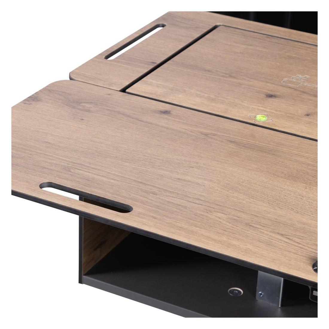 Inclui um mobiliário em resina e contraplacado, guias e dobradiças em aço, bem como uma perna ajustável para regular a inclinação.