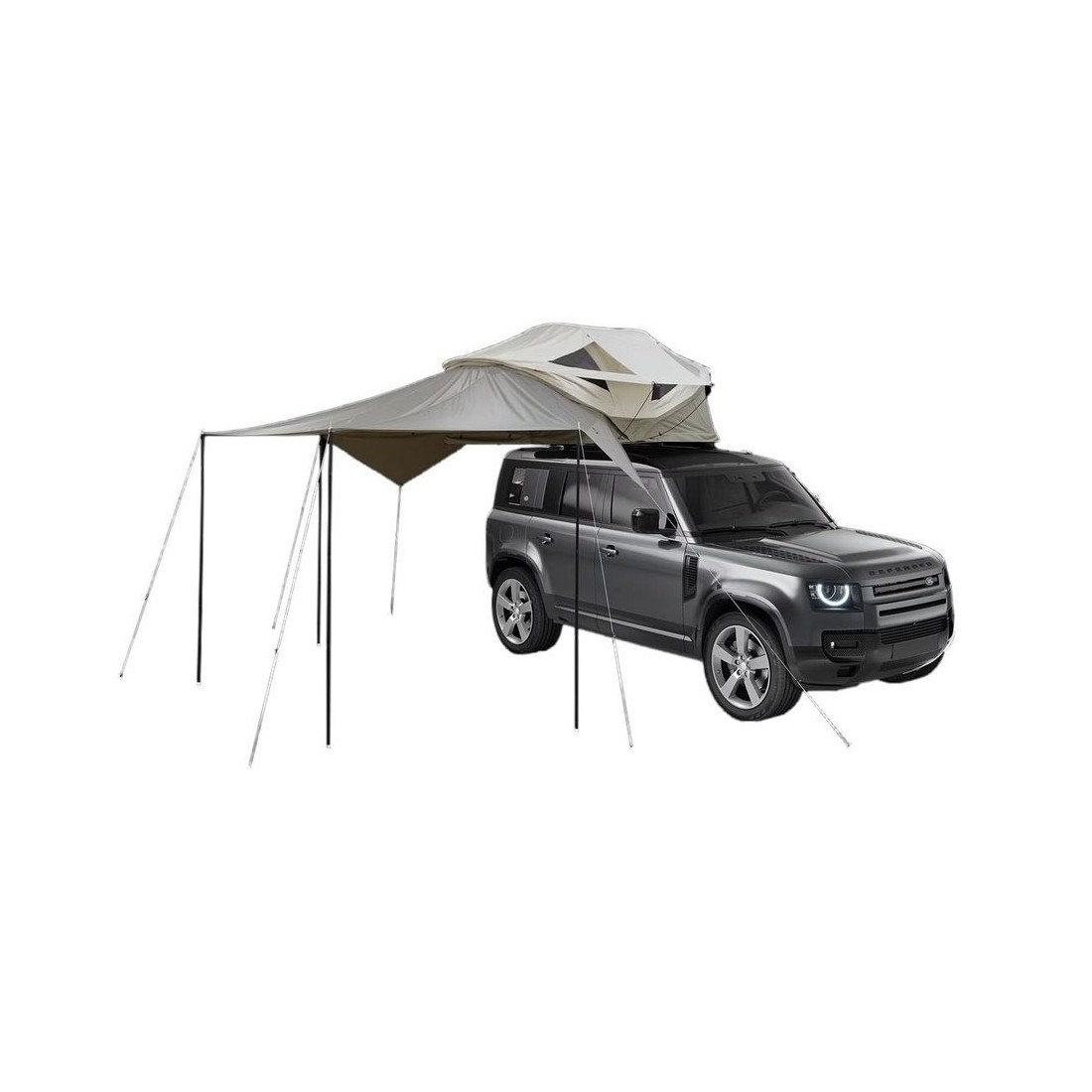 Encaixa e prende-se perfeitamente à tenda do telhado Thule abordagem. A instalação é rápida e fácil, utilizando os zíperes da tenda para fixar o toldo.
