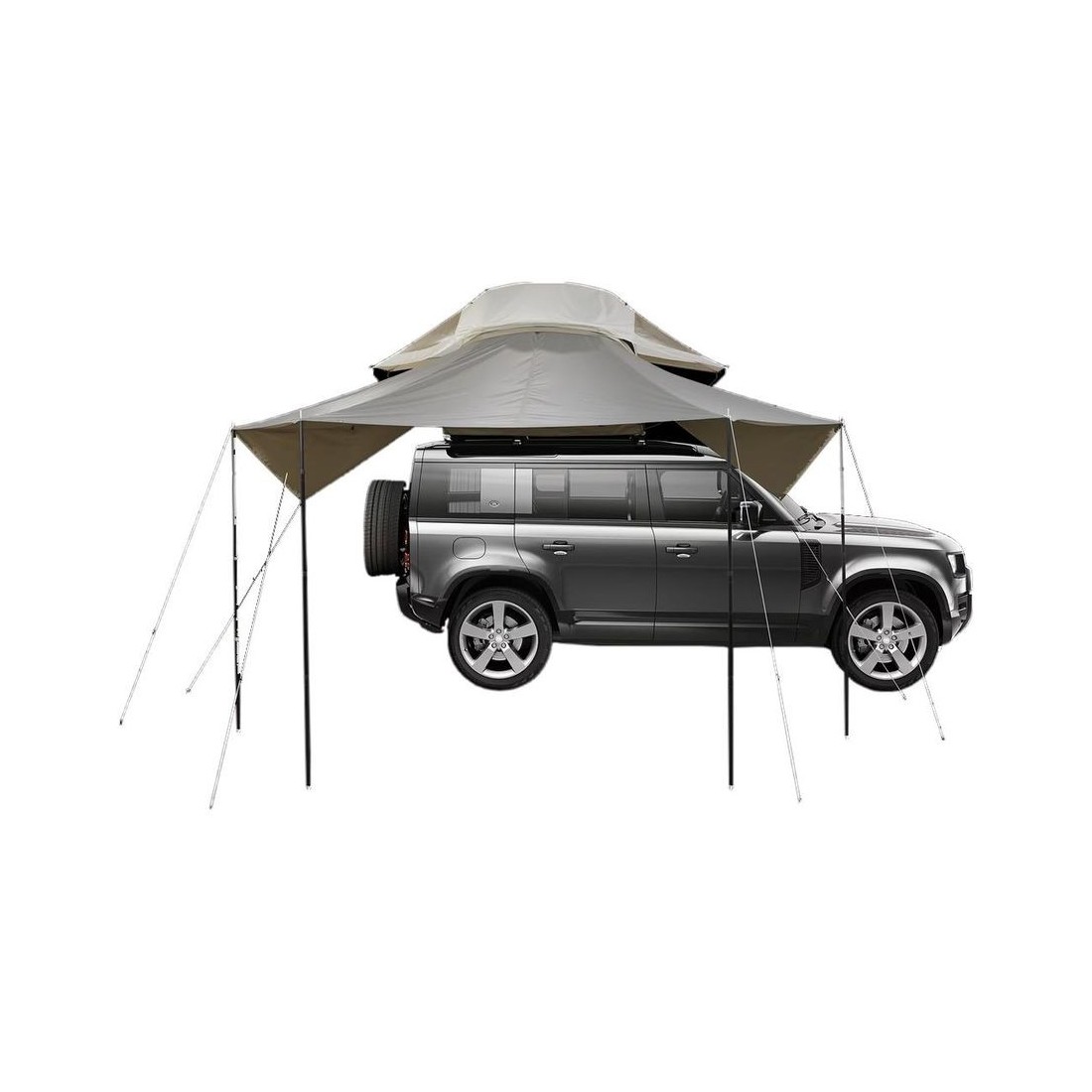 Encaixa e prende-se perfeitamente à tenda do telhado Thule abordagem. A instalação é rápida e fácil, utilizando os zíperes da tenda para fixar o toldo.