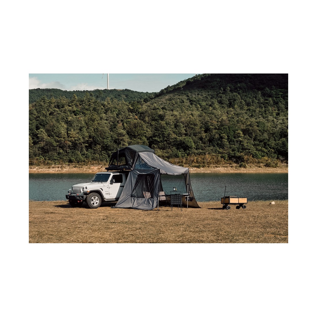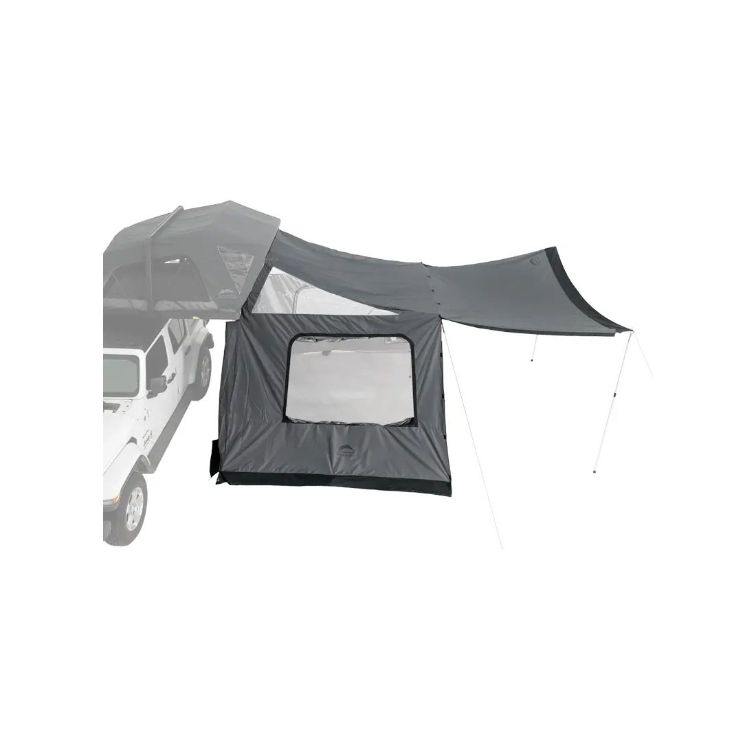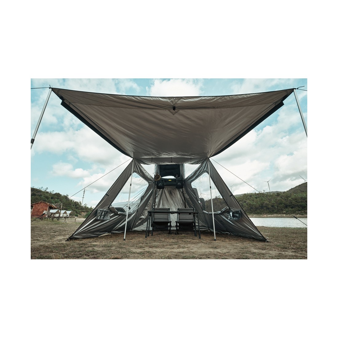 É facilmente fixado com grampos no topo da tenda, permitindo que o espaço à frente do veículo seja fechado de forma completamente privada. Este espaço é perfeito para guardar equipamento de campismo, desfrutar de uma refeição ou simplesmente descansar debaixo de cobertura.