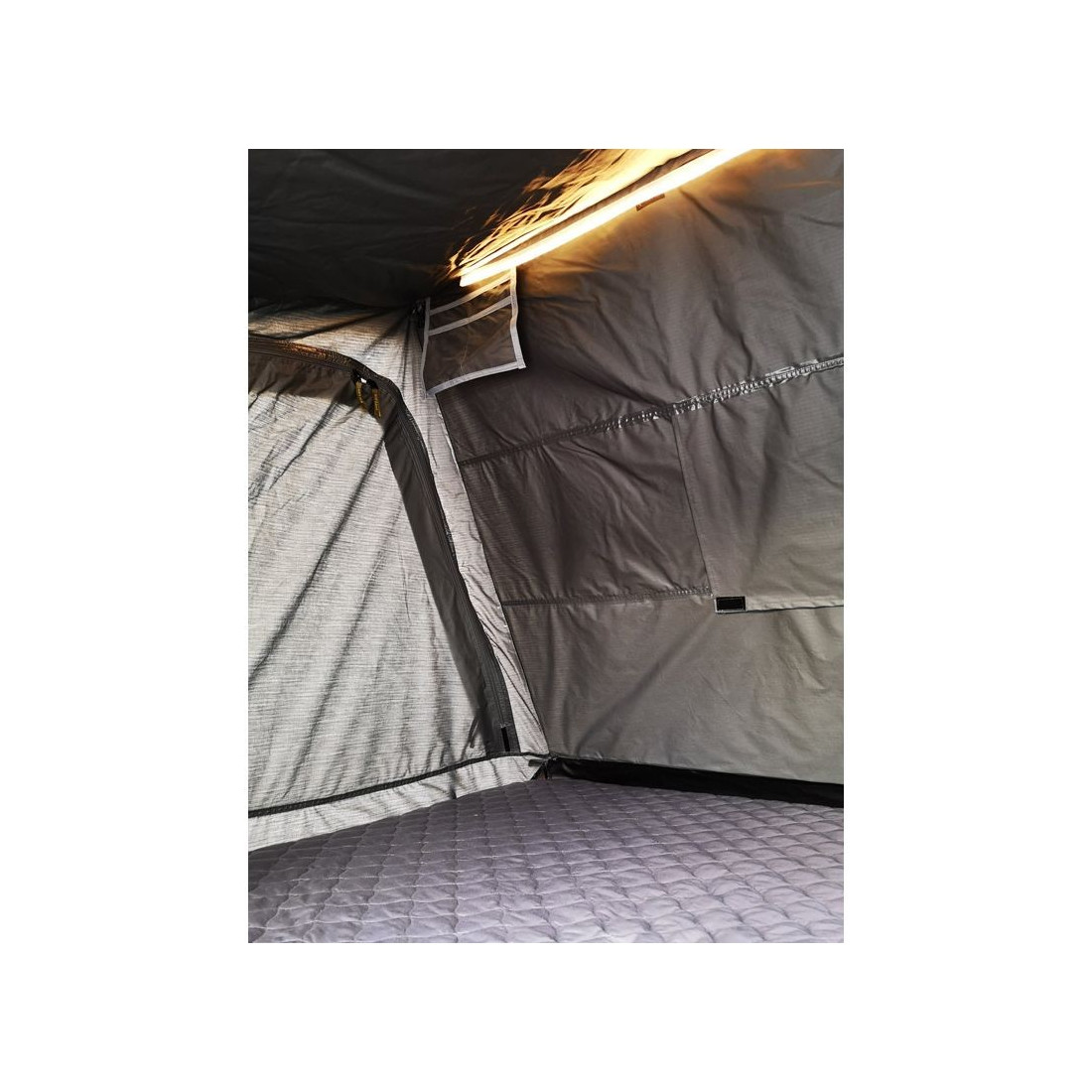 A estrutura de alumínio anodizado com cobertura reforçada e impermeável protege contra quaisquer intempéries, incluindo chuva, vento, sol intenso ou neve. A estrutura da tenda e a armação de alumínio em forma de chassis autoportante distribuem o peso de forma mais eficiente e tornam o conjunto mais leve. Além disso, a lona é resistente aos raios UV, garantindo durabilidade e conforto em qualquer estação do ano.