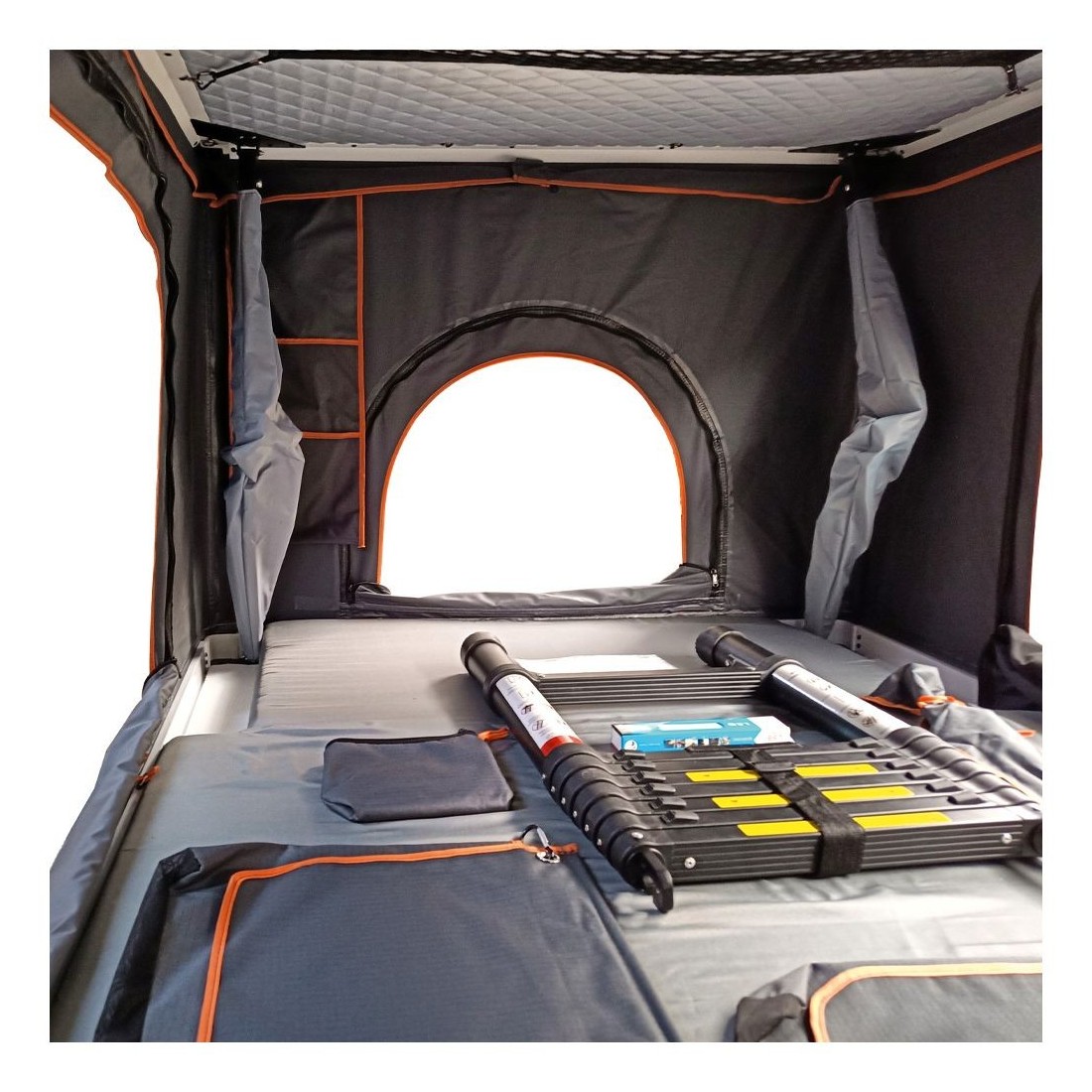 O acesso à tenda a partir do solo é muito fácil graças à escada telescópica embutida que pode ser localizada em qualquer uma das duas entradas disponíveis. A escada pode ser estendida até 2,60 metros e suportes um peso máximo de 150 kg.