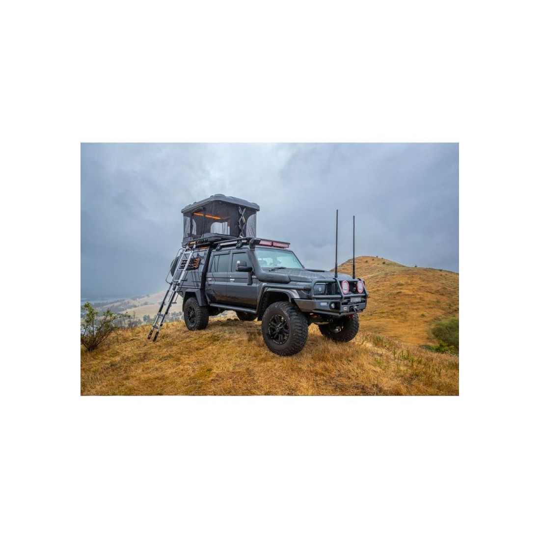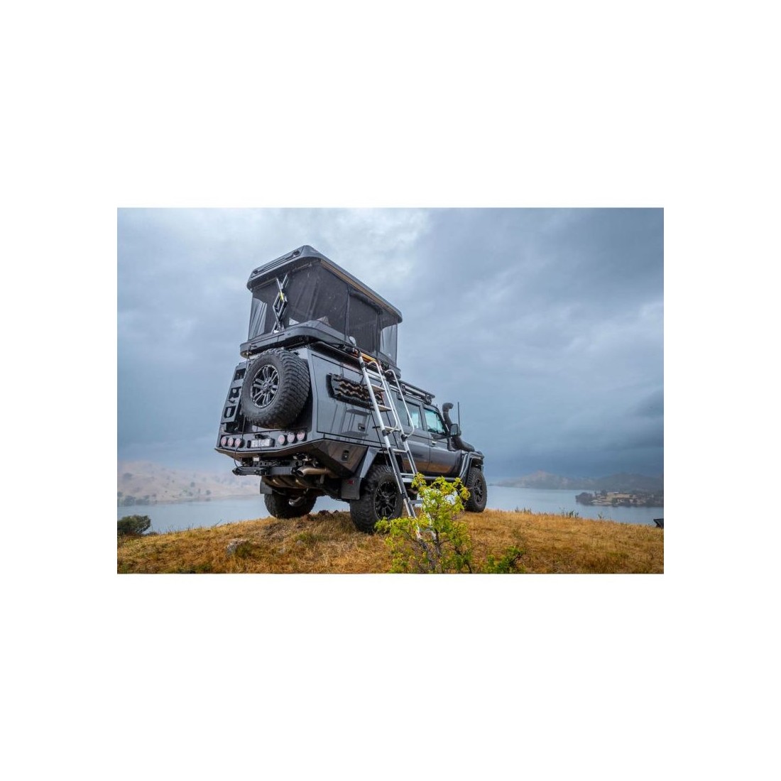 A escada, por outro lado, tem características nunca antes vistas em outras barracas de teto: ela é armazenada em um compartimento especial na área superior da concha (separada da área de dormir) que deixa espaço para guardar também sacos de dormir. É acessível através da porta traseira e é protegido por 2 Correias em D com trava. Escotilha de acesso com mola que mantém automaticamente a escada aberta para fácil recuperação. Degraus inclinados para permanecerem planos sob os pés quando no lugar. Ajuste de 3 estágios para se adaptar a diferentes alturas de teto. Fabricado em alumínio e com degraus grandes (360x175 mm).