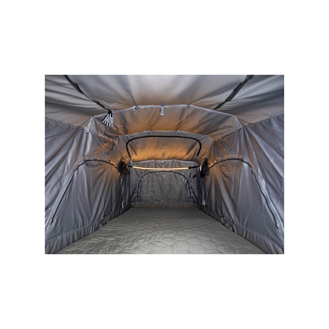 Inclui um colchão de espuma que garante o descanso. Além disso, dispõe de uma tira LED interior com regulador de intensidade, perfeita para criar um ambiente agradável durante a noite. A tenda inclui ainda uma escada telescópica de alumínio, extensível até 2,30 metros e com capacidade para até 150 kg, permitindo ajustar a altura consoante o terreno e garantindo estabilidade mesmo em superfícies irregulares.