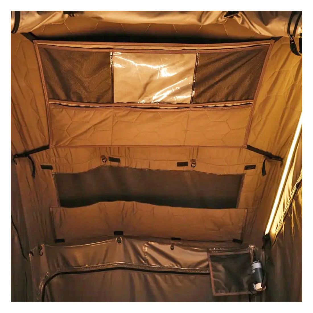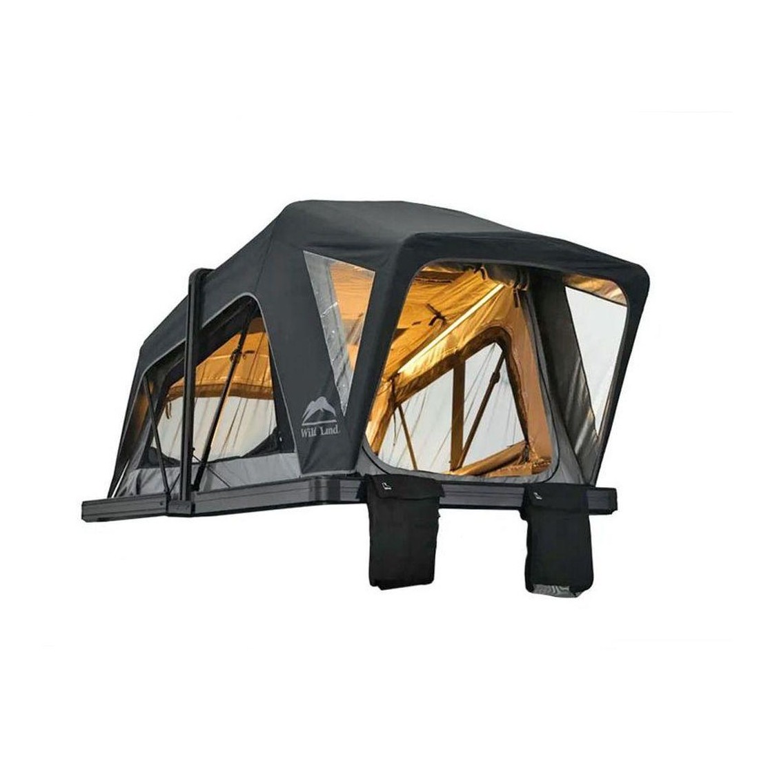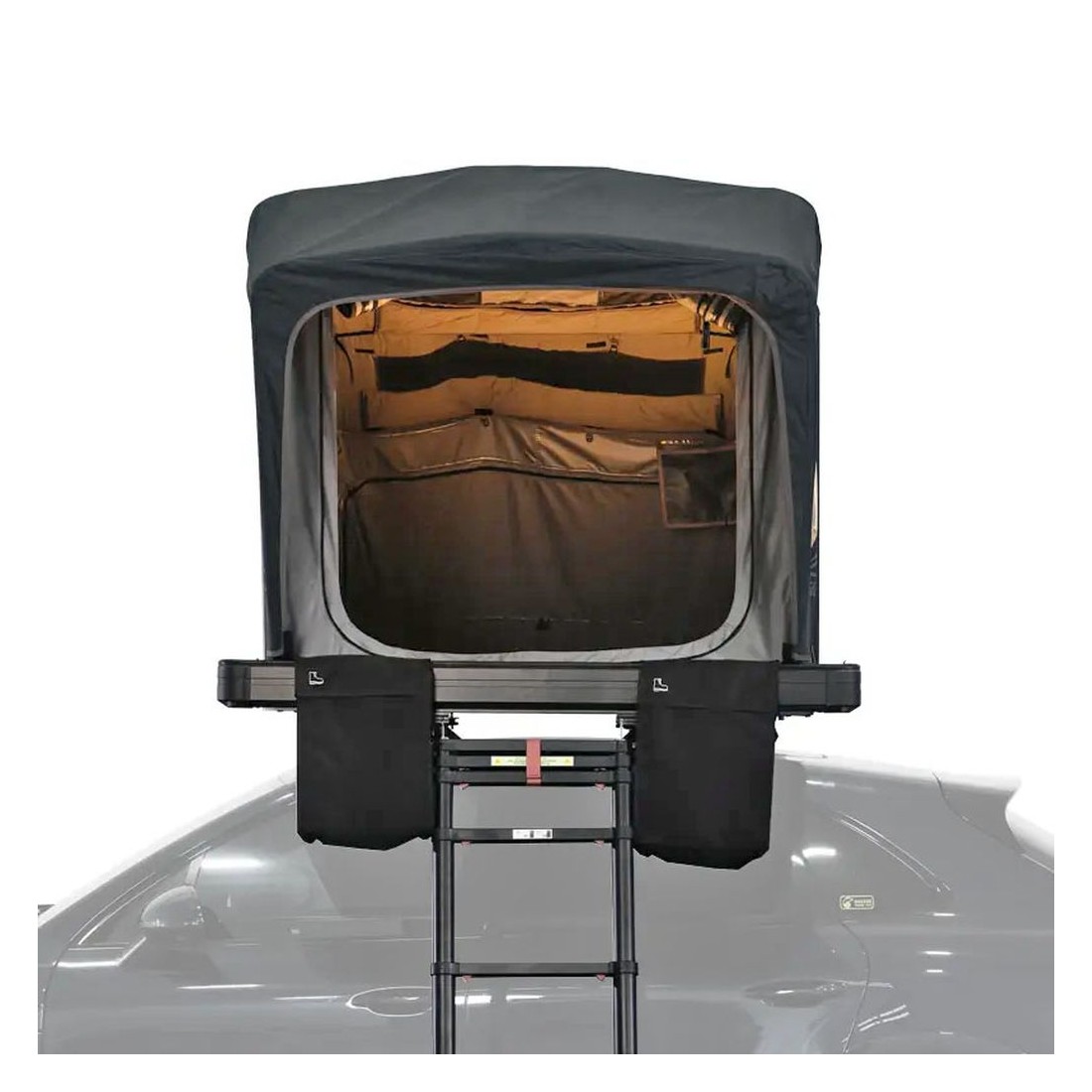 No interior, a tenda Caramiña inclui um colchão autoinflável de 10 cm e uma malha anticondensação, garantindo um descanso confortável em qualquer estação do ano. Possui três janelas panorâmicas e uma porta, proporcionando ventilação constante e vistas privilegiadas desde a altura do veículo, tornando cada noite uma experiência única de conexão com a natureza.