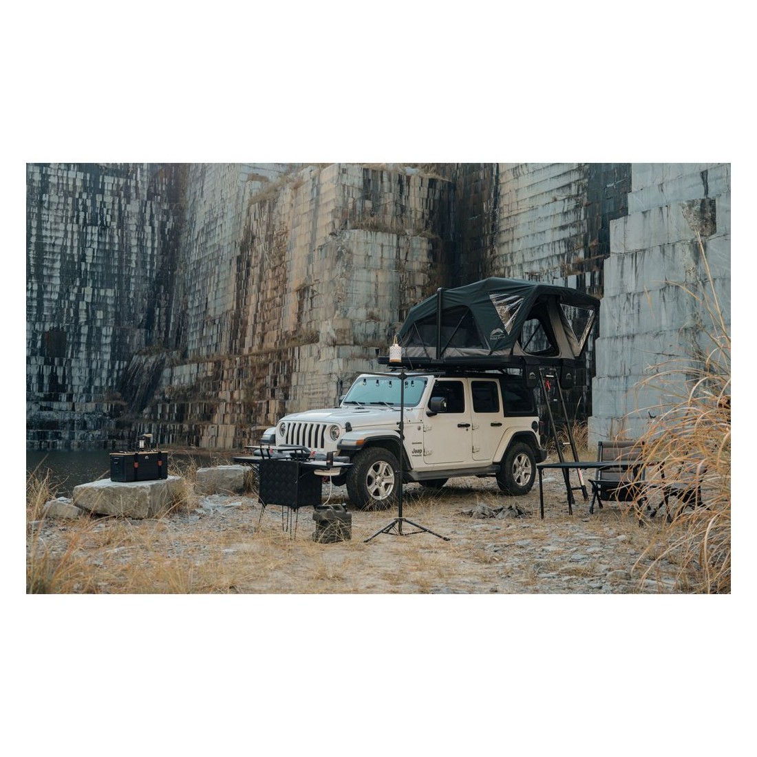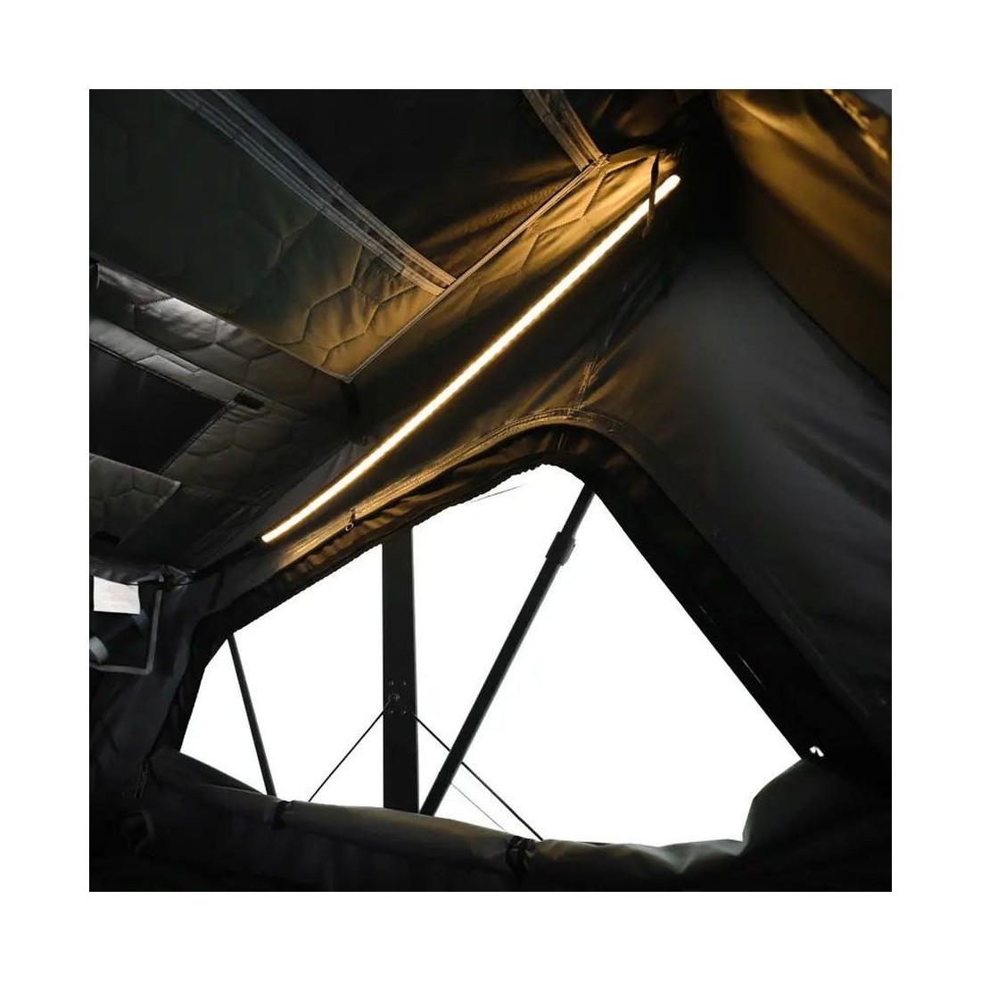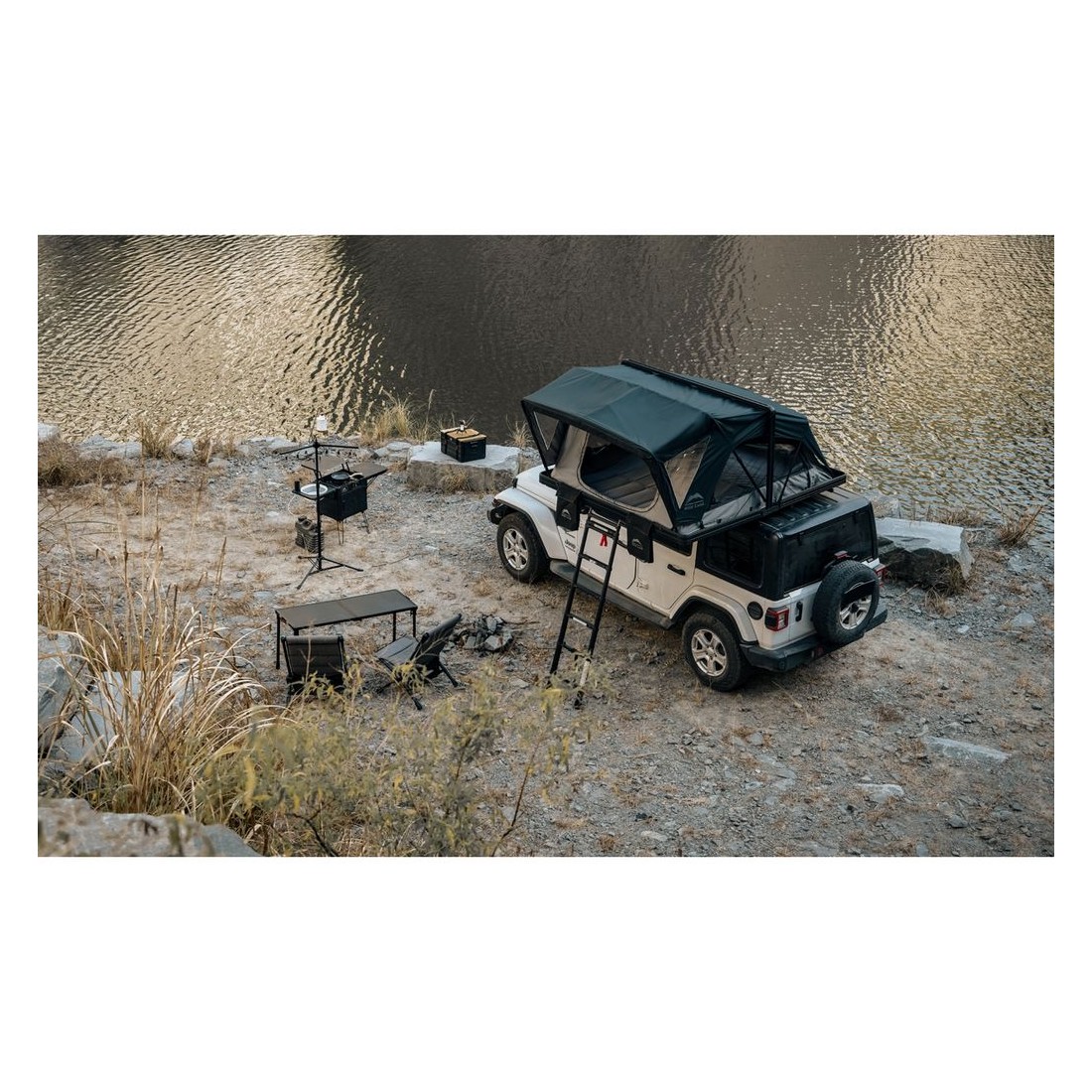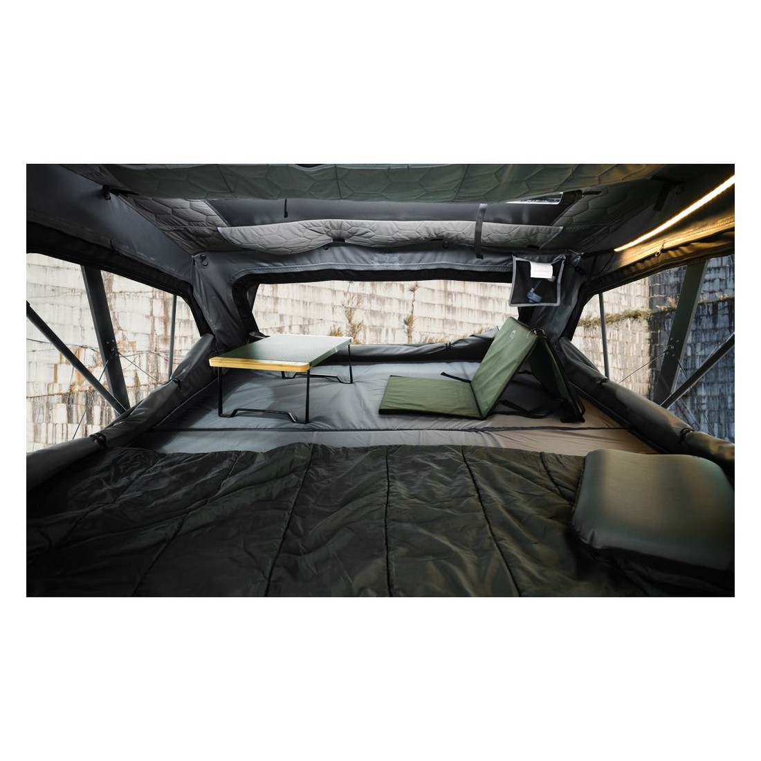 O seu interior alberga um colchão auto-insuflável com 10 cm de espessura sobre uma malha anti-condensação, concebido para que possa dormir em casa, independentemente da altitude ou da estação do ano. Três janelas panorâmicas e uma porta larga não só oferecem ventilação contínua, como também lhe proporcionam vistas privilegiadas a partir das alturas do seu carro.