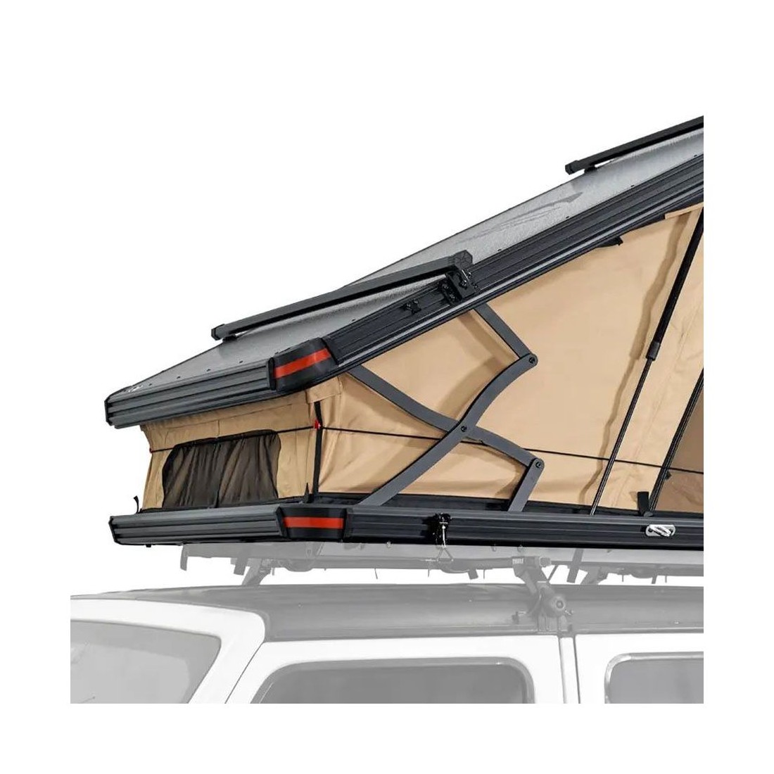 A cobertura exterior é fabricada em 210D Polyoxford, um tecido resistente e durável que protege contra chuva, vento, sol e neve. Para as noites mais frias, a tenda possui uma entrada lateral que permite conectar um sistema de aquecimento estacionário a partir do veículo, garantindo conforto mesmo em condições extremas.