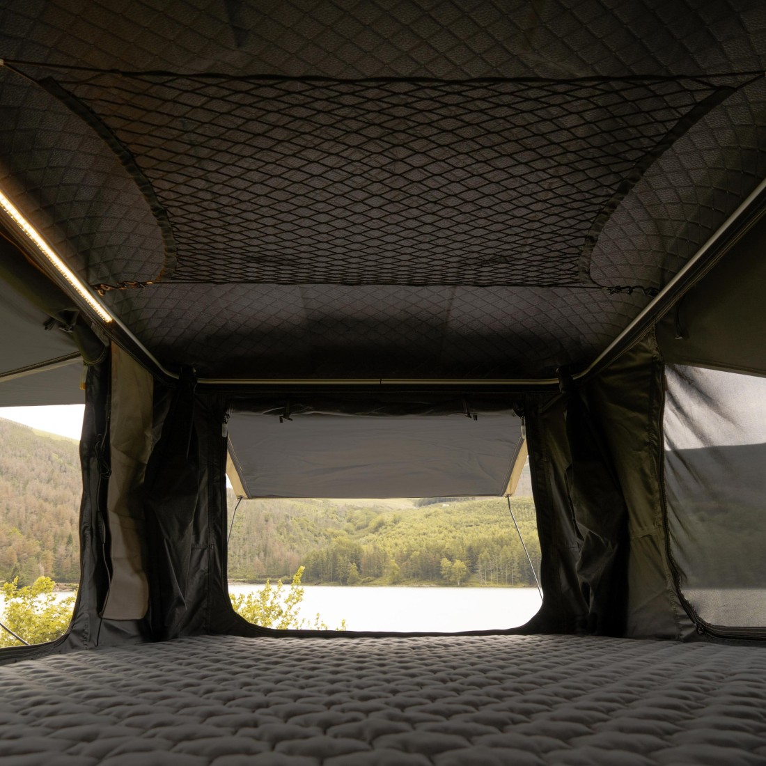 O seu interior é concebido para o descanso. Tem um colchão de espuma de alta densidade de 7 cm, luz LED integrada, redes mosquiteiras, bolsos de arrumação e tudo o que precisa para se desligar em qualquer lugar. Espaçoso, luminoso e arrumado, tem também duas grandes portas e janelas que garantem ventilação e conforto.