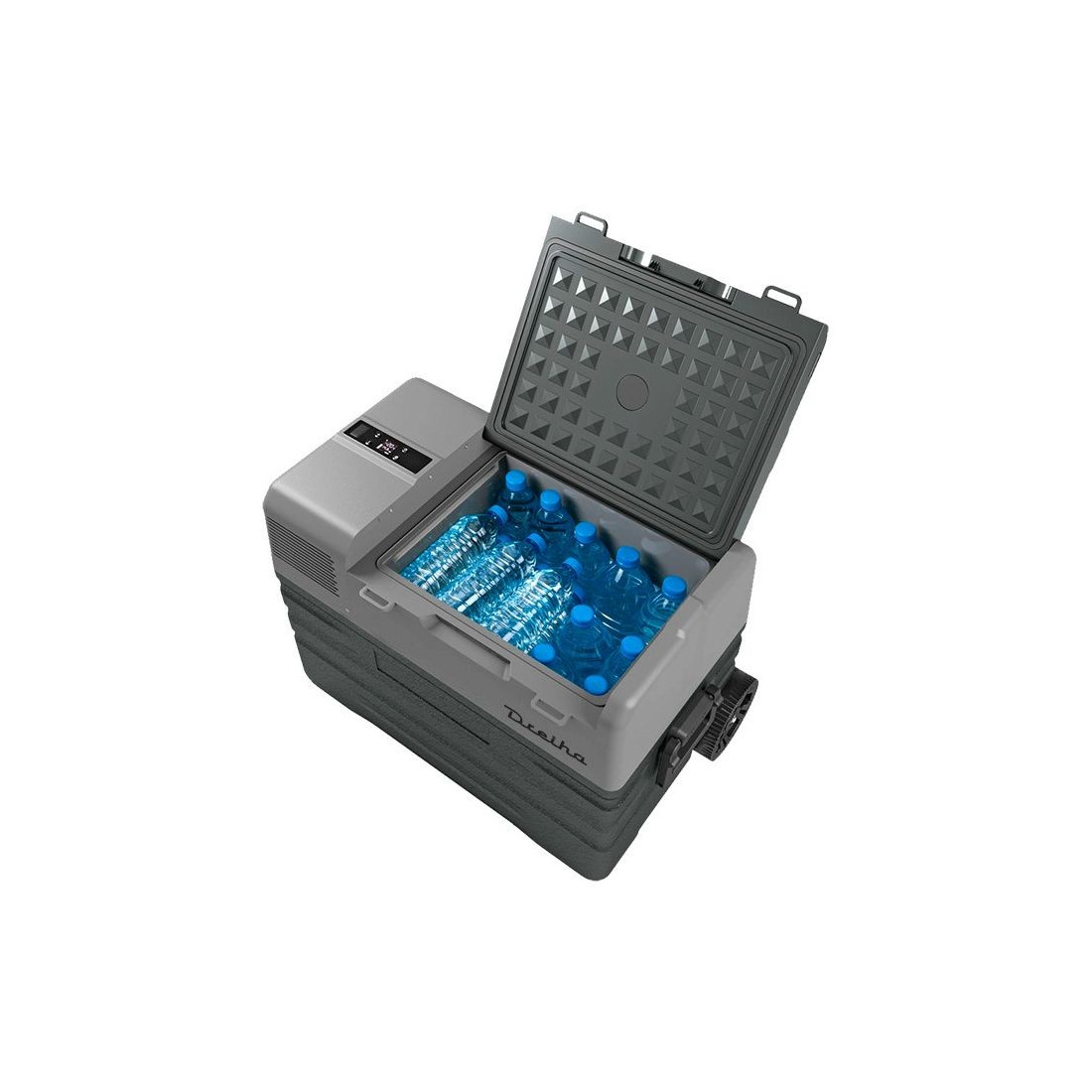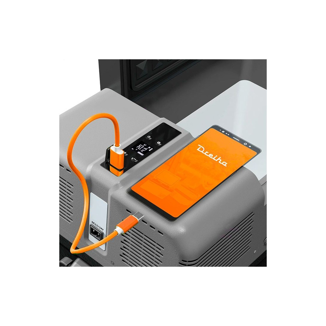 Compatível com qualquer Smartphone ligando-o à APP Dreiha CBX via Bluetooth. Controle a temperatura, ajuste o nível de proteção da bateria escolhendo o consumo, ligue ou desligue o frigorífico e monitorize o nível da bateria. Inclui ligação à porta USB para carregar dispositivos.