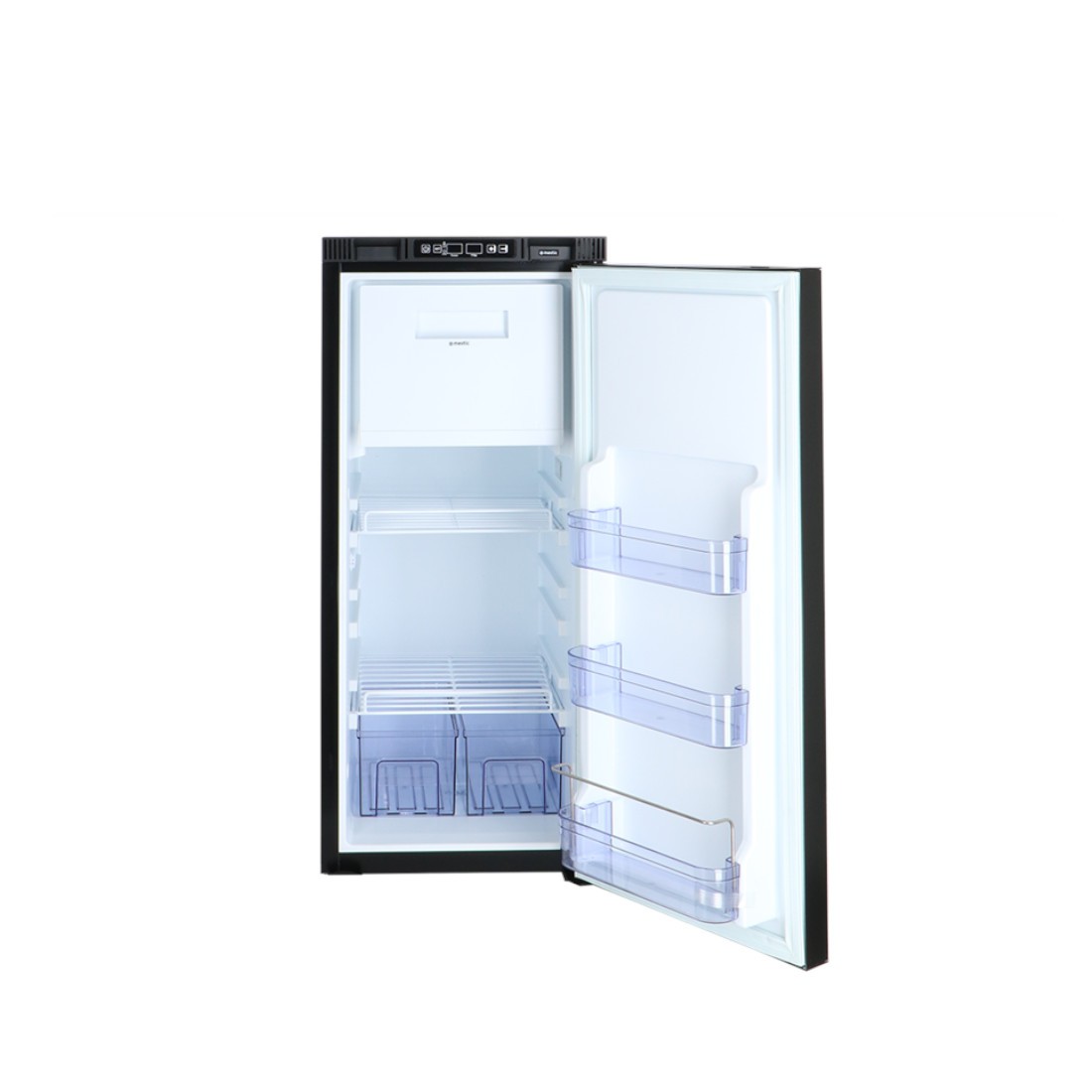 Frigorífico fixo de 90 litros com compressor, dupla zona de temperatura (frigorífico e congelador), controlo inteligente através de aplicação, baixo consumo a 12V e design compacto ideal para instalação em veículos camper, autocaravanas e carrinhas.