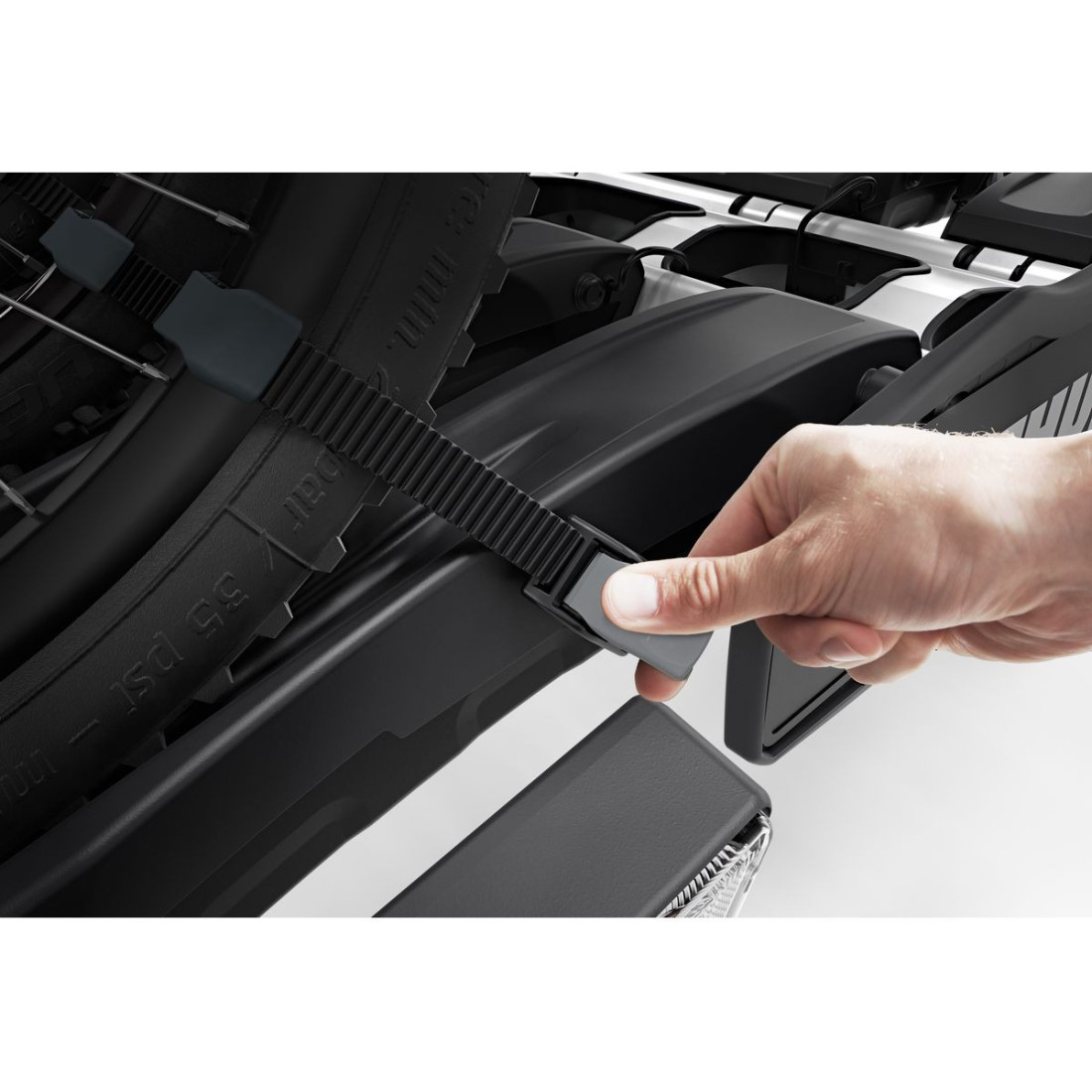 Fivelas ajustáveis de liberação rápida com Correias longas para fácil fixação das rodas (até 4,7") para o transporte de bicicletas gordas.