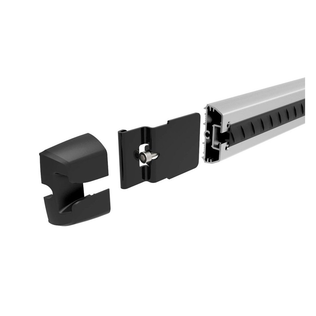 A fixação é feita sem a necessidade de furar a porta. Basta fixar o trilho de fixação à porta traseira.
