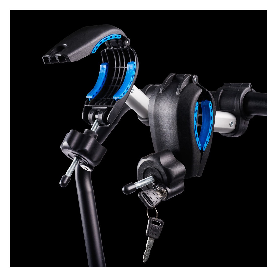 - Fixação da bicicleta por meio de um braço móvel com revestimento de borracha.