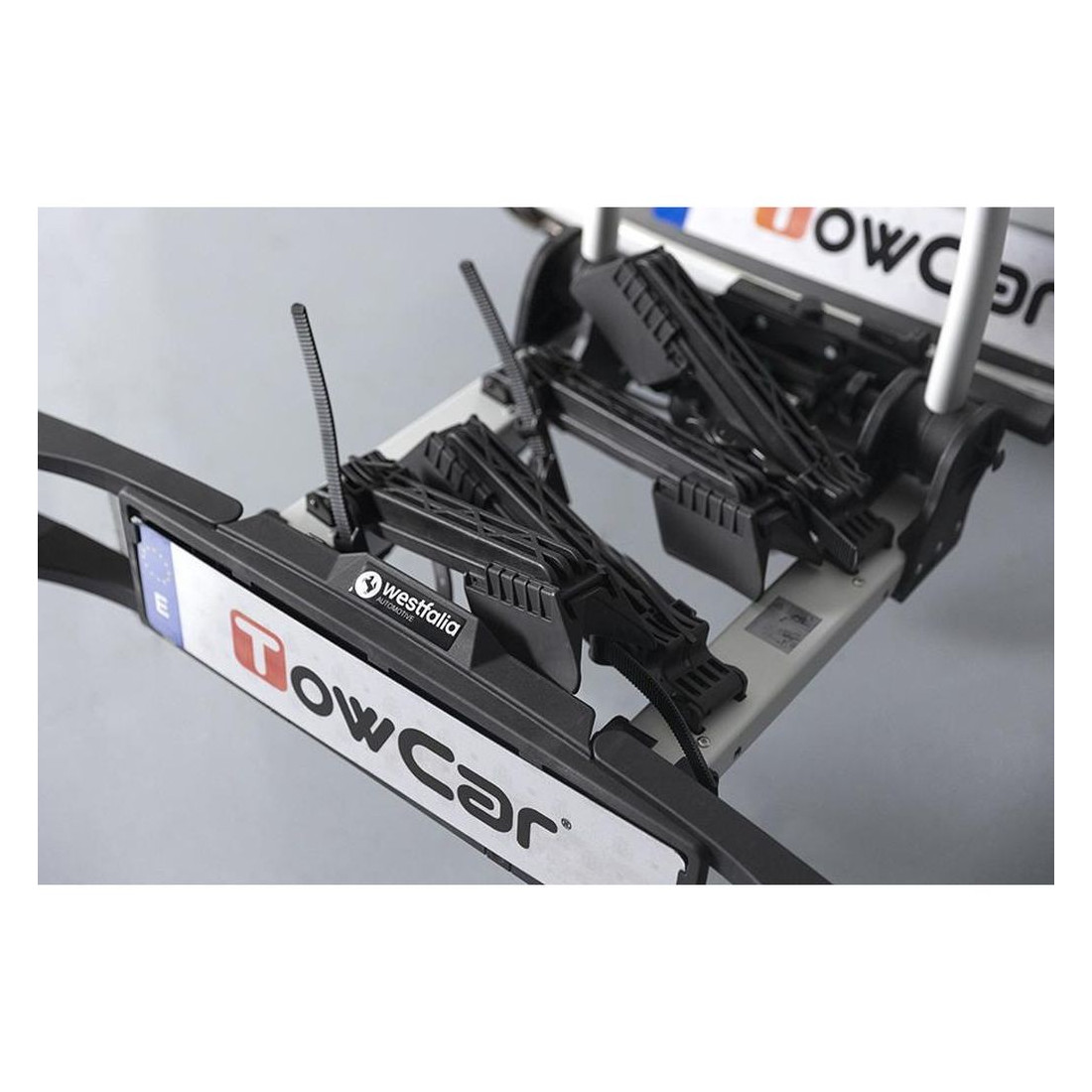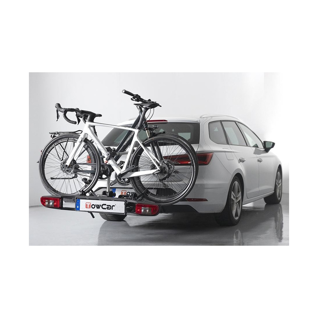 Porta-bicicletas com o qual você pode transportar confortavelmente até duas bicicletas na bola de reboque.