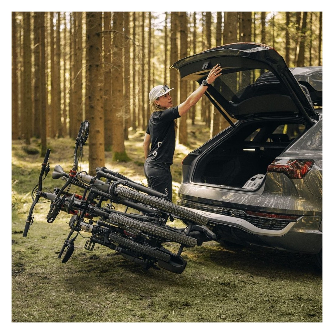 É dobrável, o que facilita o acesso ao porta-malas mesmo com bicicletas carregadas.