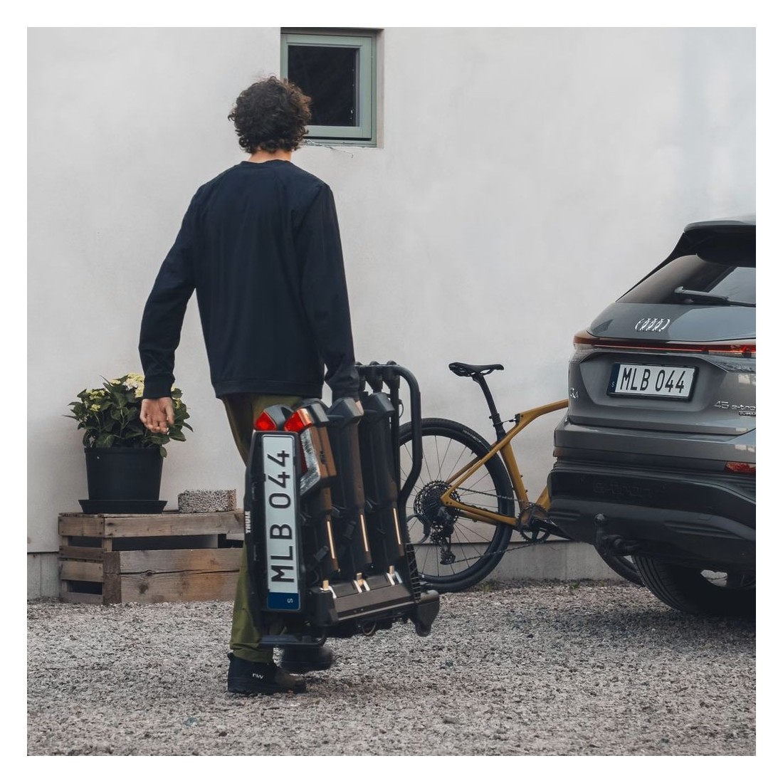 O sistema de dobragem rápida permite reduzir o espaço do Porta-bicicletas e armazená-lo no porta-malas do veículo ou ocupar menos espaço quando não está em uso. Inclui pegas integradas para um transporte confortável.