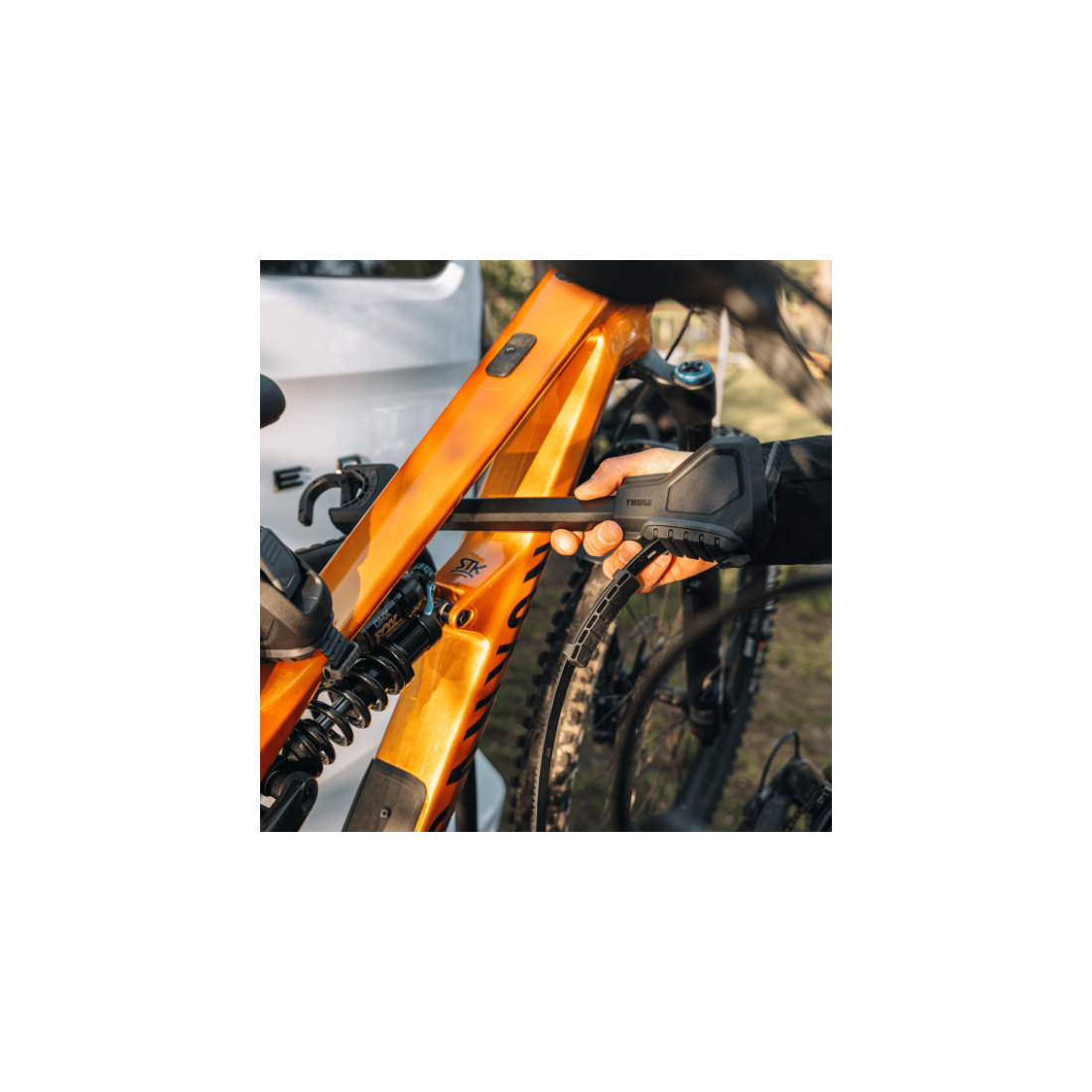 O suporte Thule VeloSpace 3 suporta bicicletas até 30 kg e distâncias entre eixos até 1350 mm, incluindo modelos elétricos e de montanha. A sua plataforma robusta mantém uma separação de 25 cm entre cada bicicleta, reduzindo ao mínimo o risco de contacto ou danos durante o transporte.
