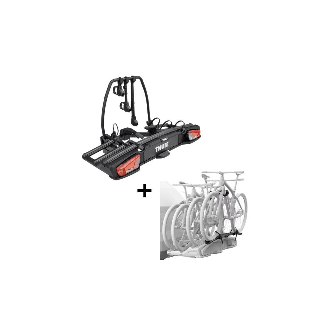 Suporte de bicicletas de bola Thule VeloSpace 3 + adaptador para 4.ª bicicleta. Este conjunto foi concebido para combinar resistência, versatilidade e facilidade de utilização. Permite transportar até 4 bicicletas, adaptando-se a diferentes tipos de veículos e necessidades de transporte.