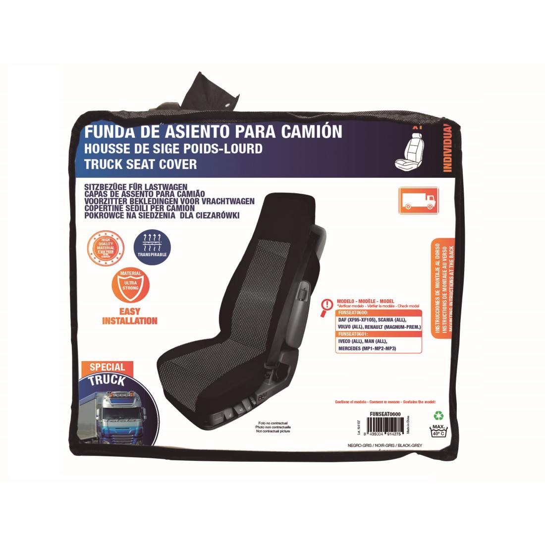 Fabricada em poliéster e com acolchoamento em foam de 6 mm, este produto combina durabilidade, conforto e resistência, oferecendo um ajuste versátil para diferentes modelos de camião.