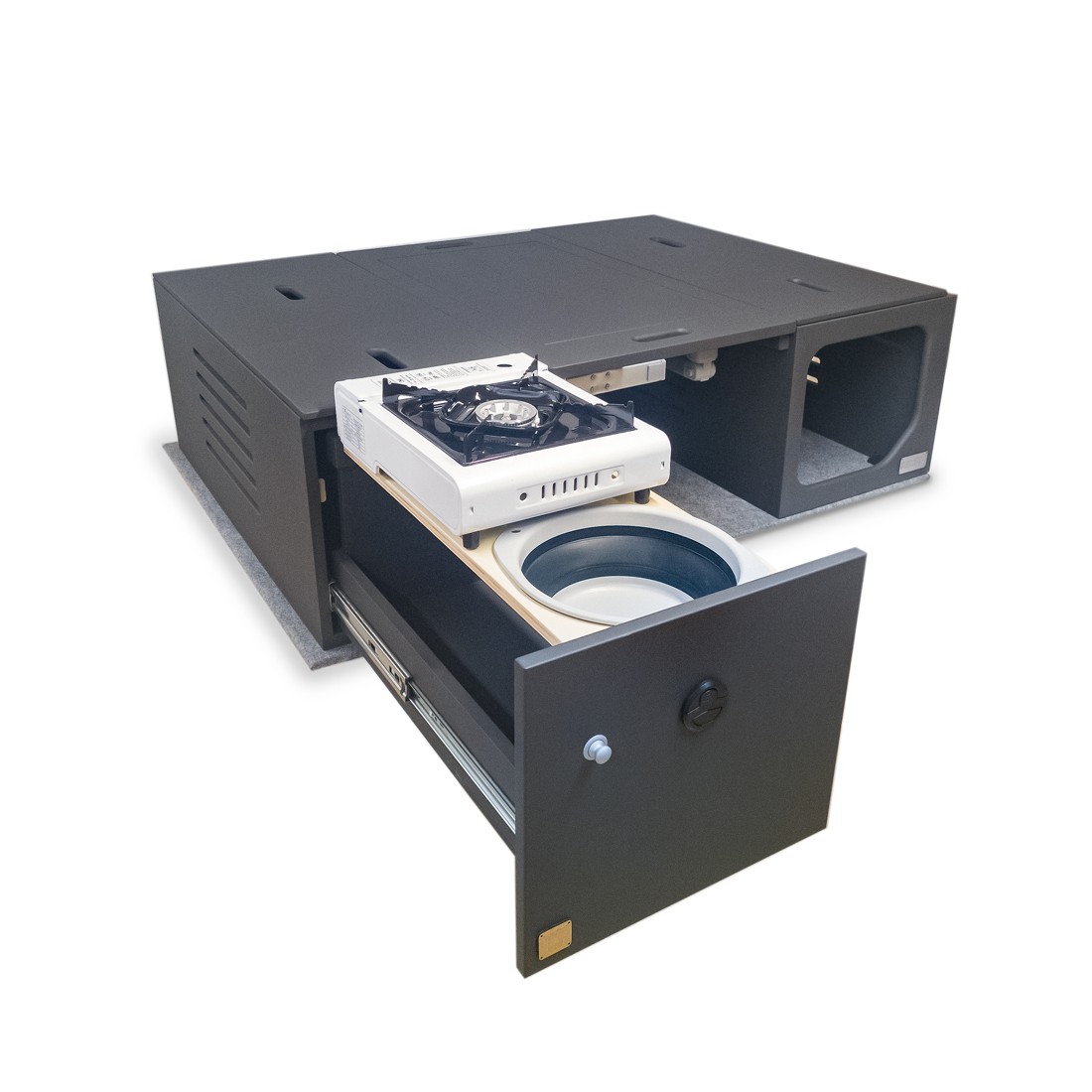 Os móveis estão fabricados em madeira de alta qualidade com certificação PEFC, realizados em aglomerado laminado de fórmica ultra resistente ou DM hidrófugo com pintura especial cinza antracite para carrinhas. Isto garante durabilidade e uma estética que se integra com o interior de qualquer veículo. A combinação de materiais robustos e design cuidado assegura um uso prolongado e confortável.